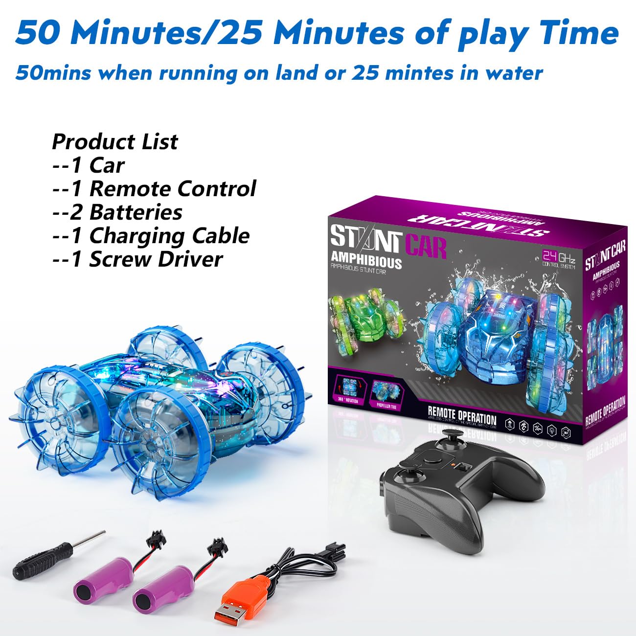 Stunts on Land and Water: This amphibious RC toy offers a full range of stunts on land and water, including 360° rotations and 180-degree flips.