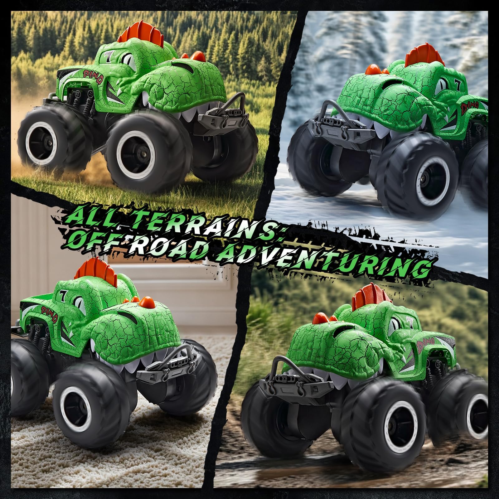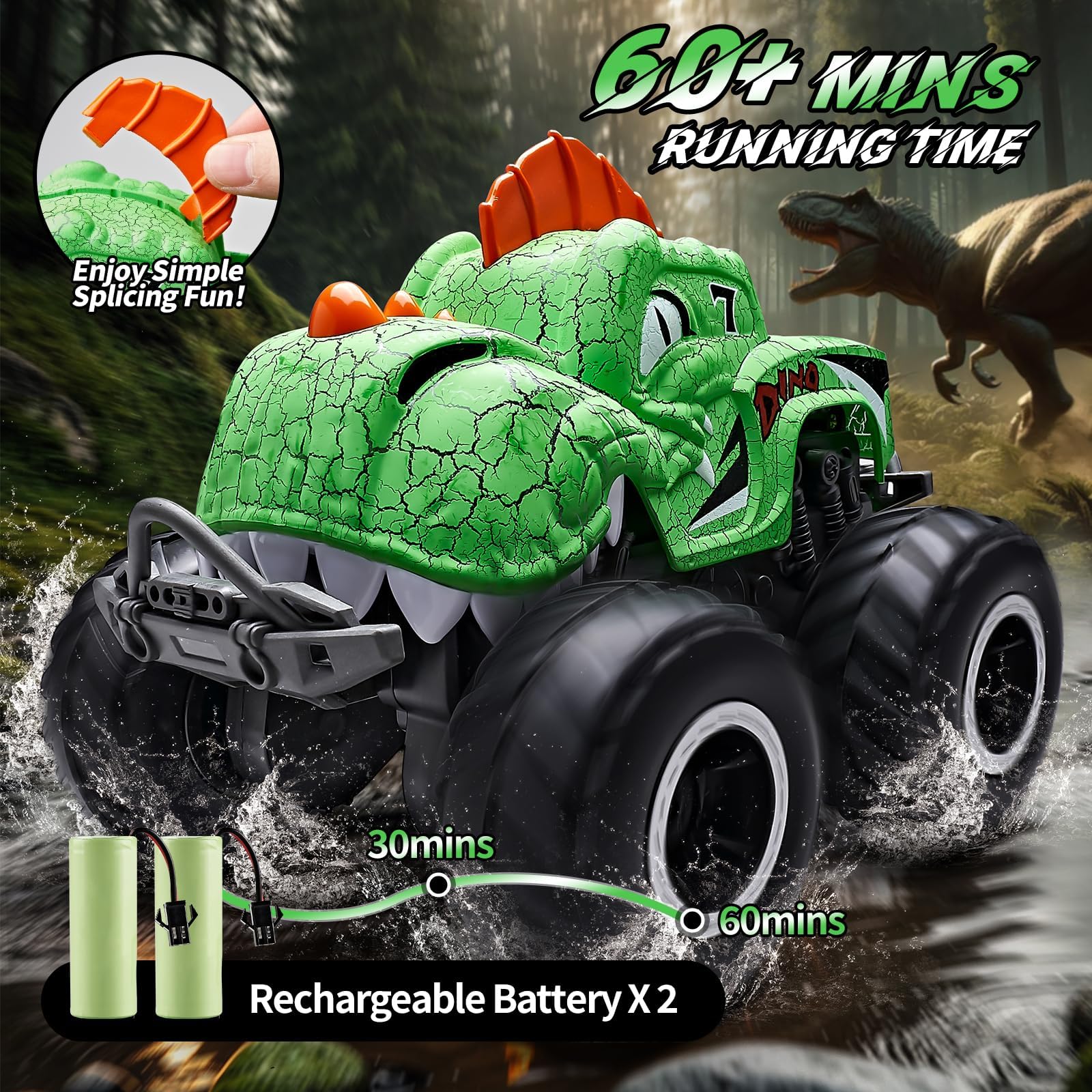 - 【Dinosaur Remote Control Cars with Stunt】The design of the dinosaur remote control car is fierce and charming, 4-8 year-olds can easily control it in situ to do 360° rotation, tilt head driving and other amazing stunts, "One-Touch Performance Mode" cool tricks, allowing younger children to drive easily! Colorful LED lights will keep children excited and make it easier to keep track of nighttime adventures. If your kids are dinosaur lovers, they will be mesmerized by this dinosaur truck