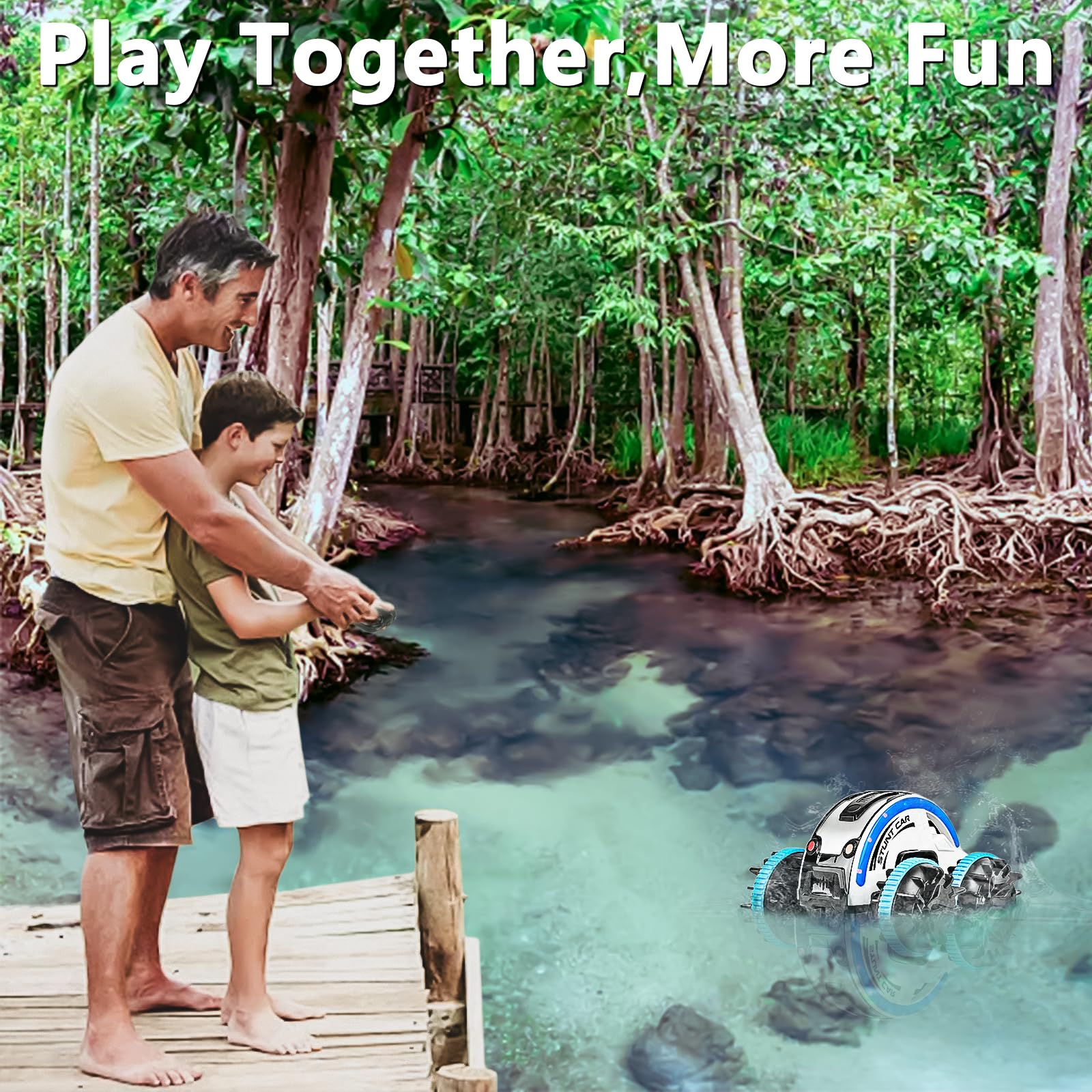 - 【Amphibious RC Car】Waterproof all terrain stunt toy car can shuttle freely in all terrains like lake, beach and grassland.RC car can be completely immerse in water and played normally, great selection for holiday, Birthday gift, campings, outdoors.