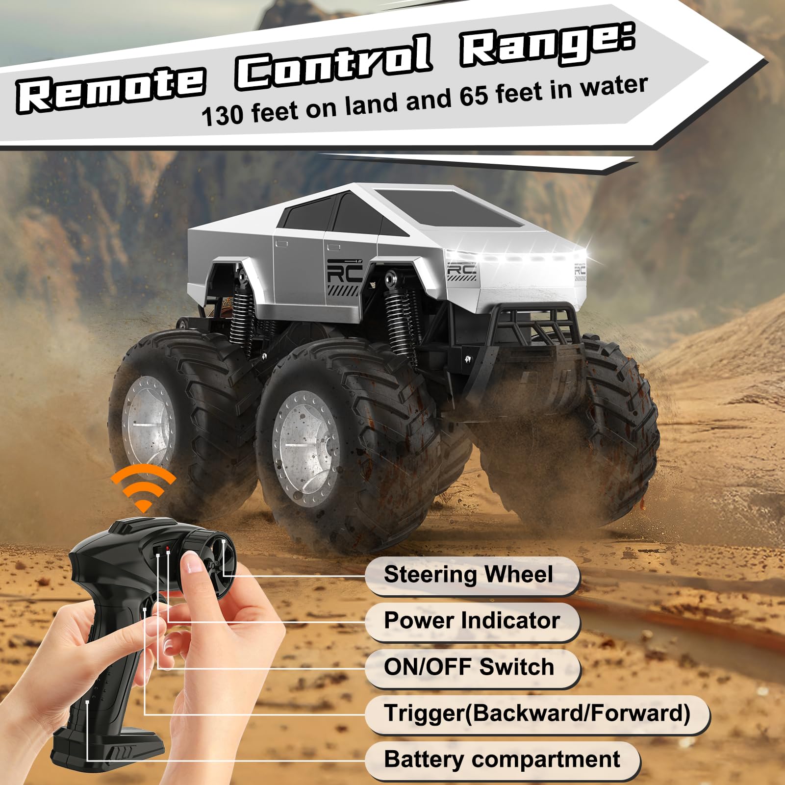 - 【Anti-Interference Long Distance】Equipped with a 2.4GHz full-featured proportional radio control system, this RC truck offers stable control within a range of 130FT on land and 65FT on water. The long-range anti-interference design allows multiple sets of high-speed rc race toy cars will go their own way without interfering with each other, kids can play the rc car together to harvest their unique happiness, even they can have a rc stunt car race