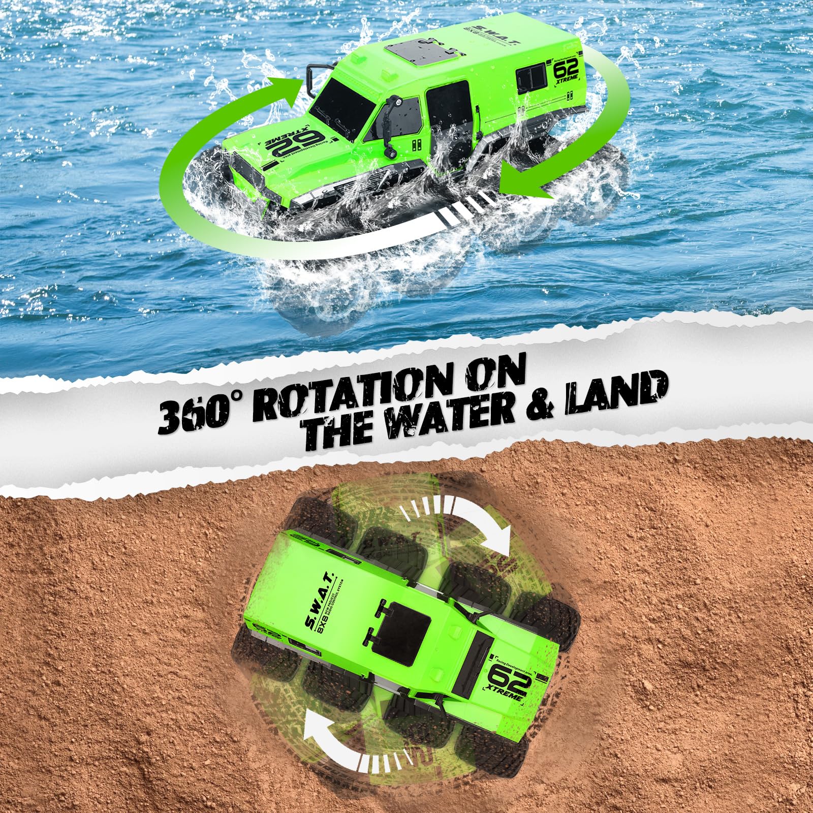 - Strong Power for All Terrain:The 8 rubber off-road wheels is more special than 4WD vehicle,it enhances off-road performance both land and water.The truck is adapt to a variety of terrain such as glass,water,ghat and road