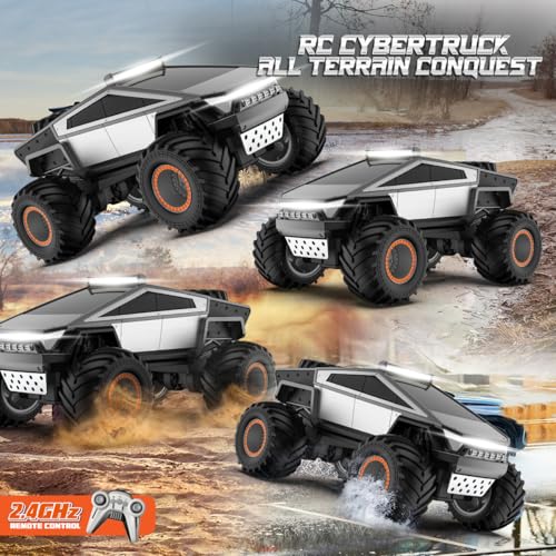 - Embrace the Coolness of the Amphibious remote Cyber Truck Toy: This LED-lit remote control car toy combines flexibility and strength, crafted from high-quality plastic and spray paint for material safety. The high-hardness PVC body and PA chassis, secured with dozens of screws and advanced electronic components, ensure structural integrity, super anti-collision durability, and rapid acceleration. Styled after a classic pickup truck, it's the perfect gift for boys and adults alike, offering a blend of monster truck appeal and cyber aesthetics