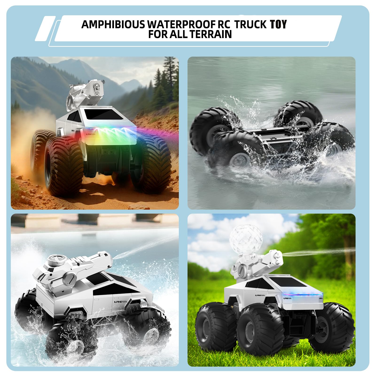 • All-Terrain Rc Car Capability for Unlimited Exploration: With its 4WD off-road capabilities, this amphibious remote control car is ready for adventure anywhere, anytime. This powerful RC truck conquers rocks, sand, mud, and more. The 2.4GHz remote ensures precise, interference-free control even in large outdoor spaces, while its waterproof design lets it glide across pools, lakes, or beaches effortlessly.