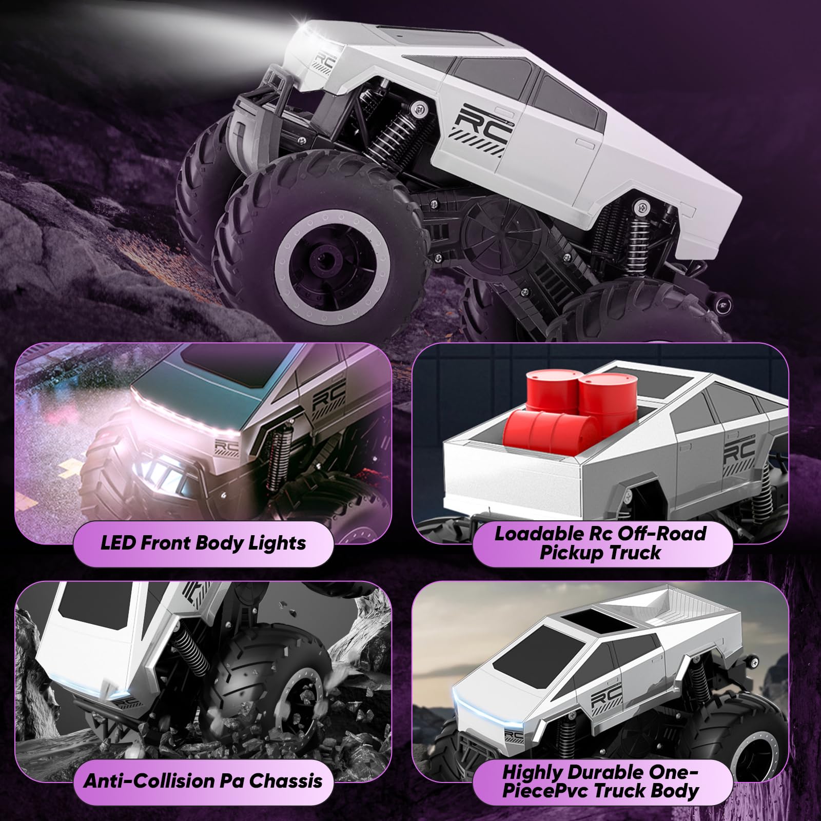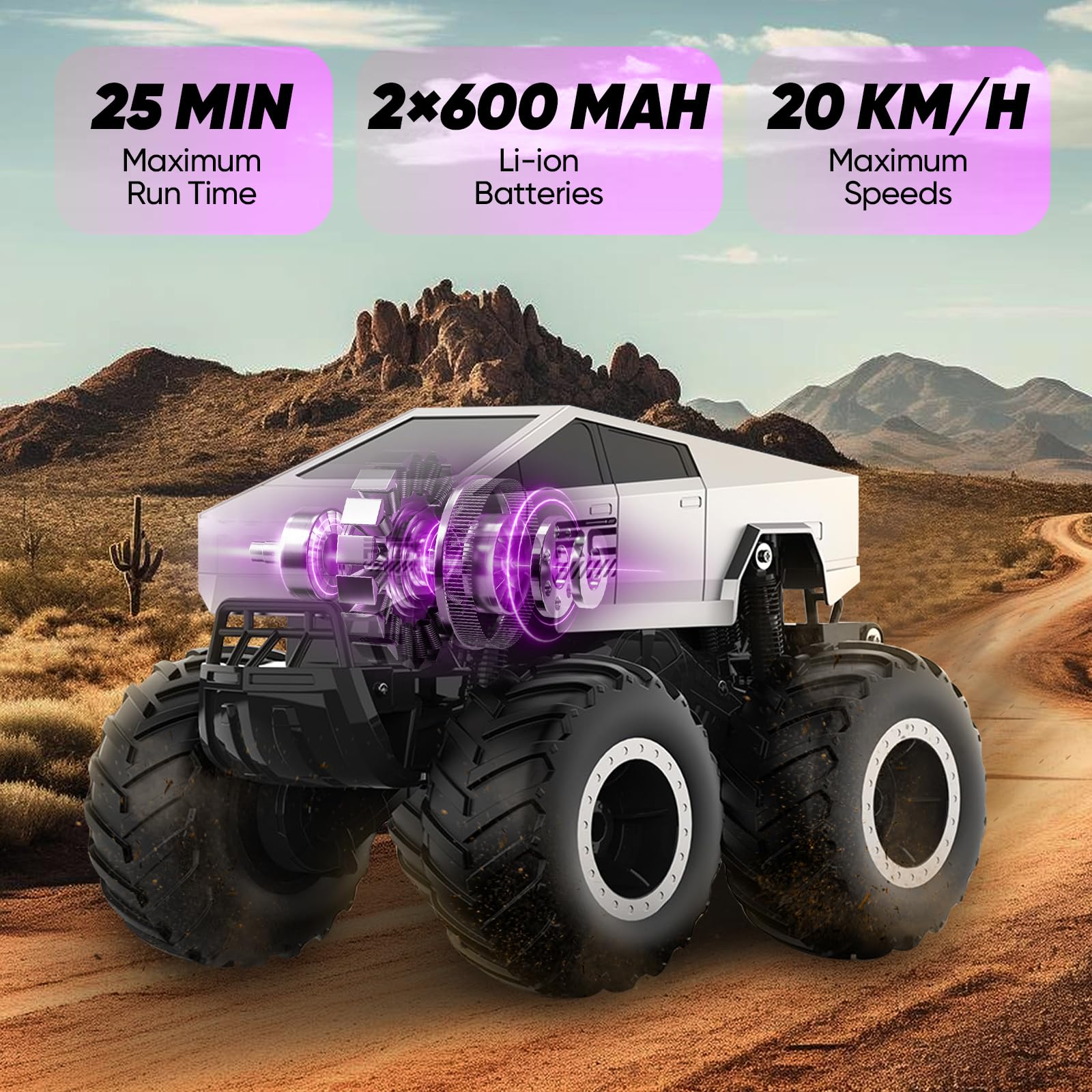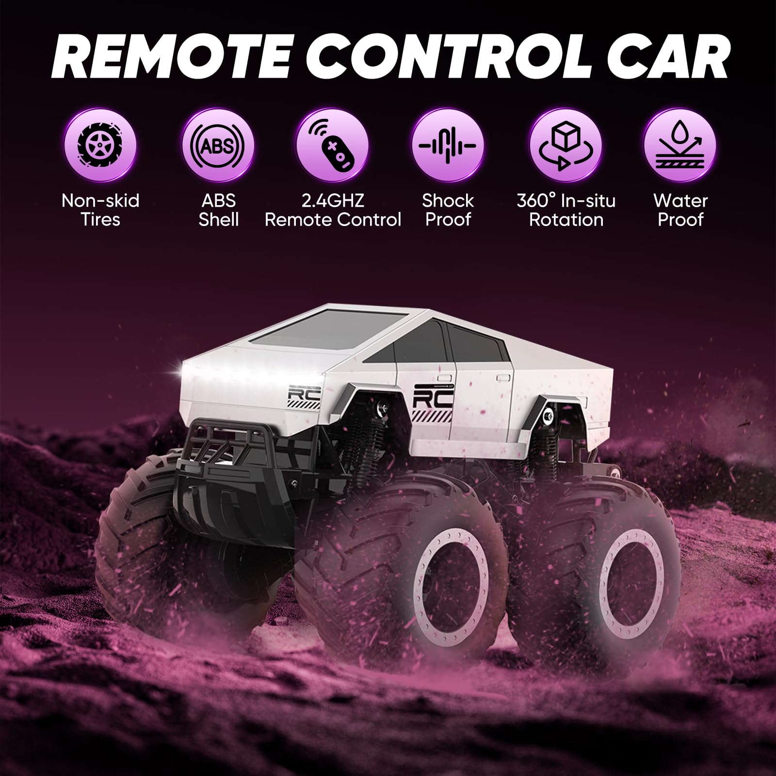 - 【All-Terrain Waterproof Design】Equipped with metal shock absorbers, non-slip rubber tires, and sealed waterproof electronics, this cyber truck remote control car is ready for all terrains. With dual motors, ball bearings, independent suspension, and durable gear differentials, it performs perfectly in any environment, no matter the weather.