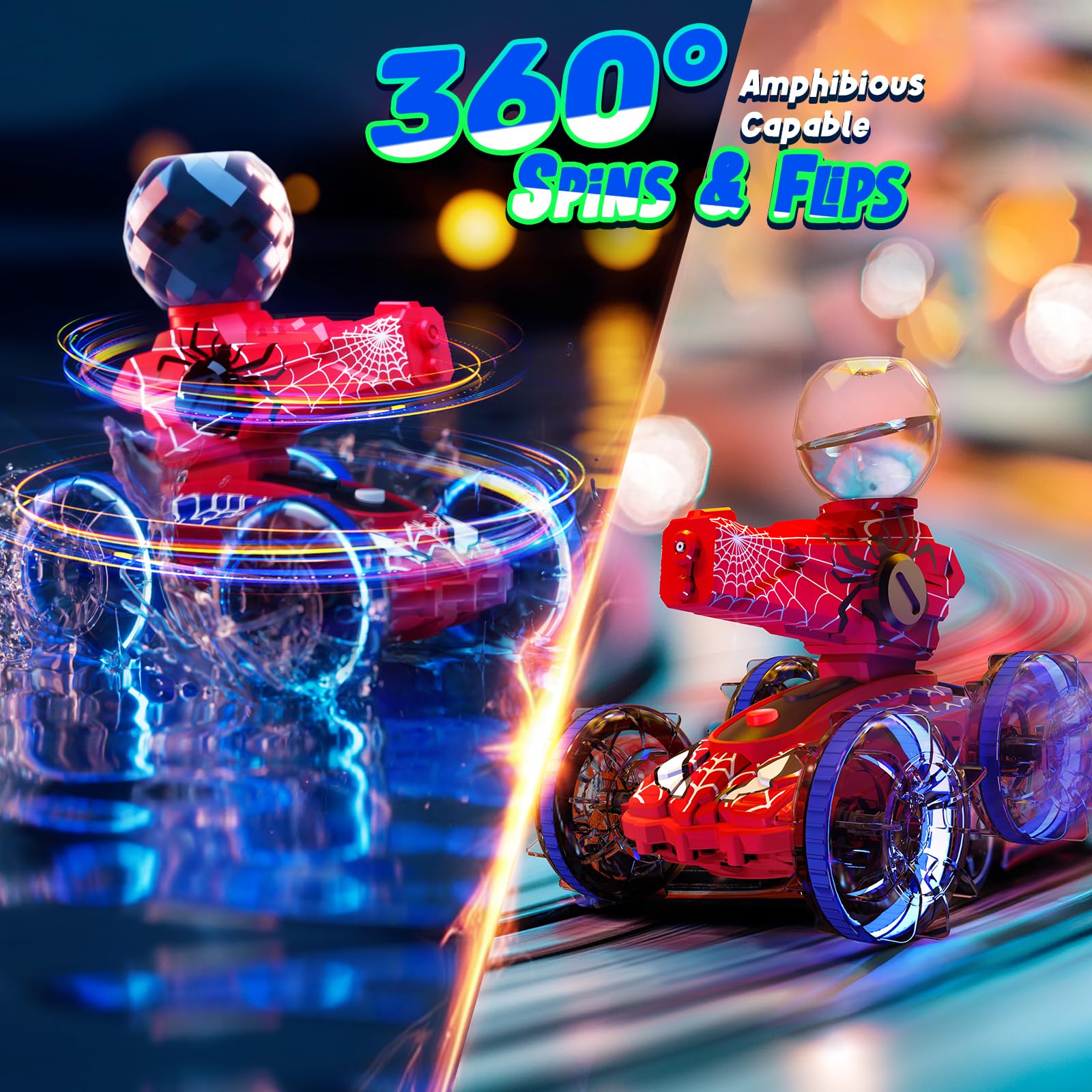 • Multiplayer Fun: Using 2.4GHz remote control technology, our RC Amphibious stunt cars support multiple vehicles running simultaneously, perfect for family gatherings or friendly competitions. Equipped with cool LED lights, the cars not only look great but also improve nighttime visibility, making the game even more exciting. It's a showstopper that adds a cool factor to every play session, making it a favorite among kids aged 6-12.
