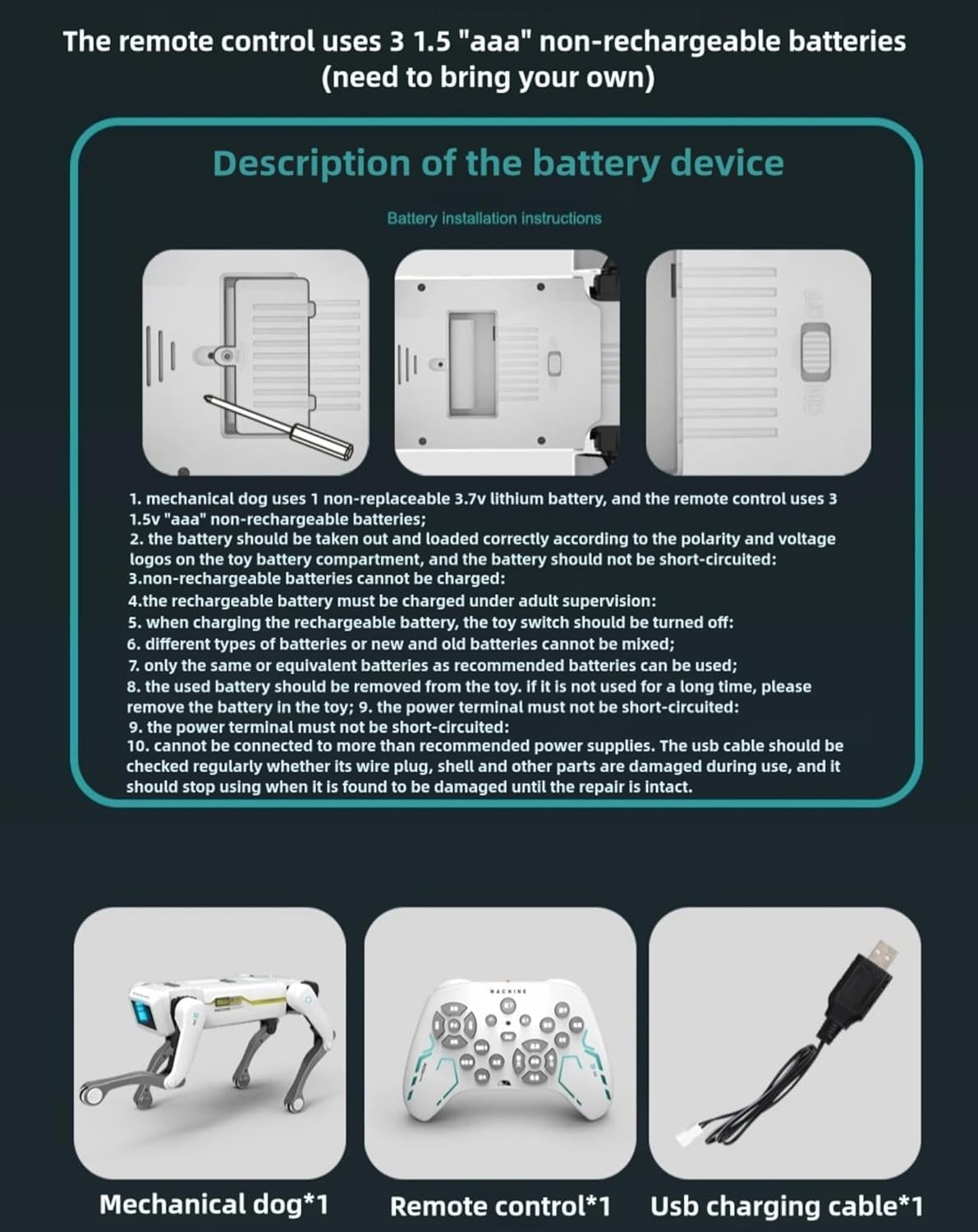- Educational and entertaining children's gift: Mechanical dogs are not only toys but also great educational tools. By controlling the mechanical dog to perform various, children can learn about remote control technology while playing, and at the same time, stimulate their interest and curiosity in technology