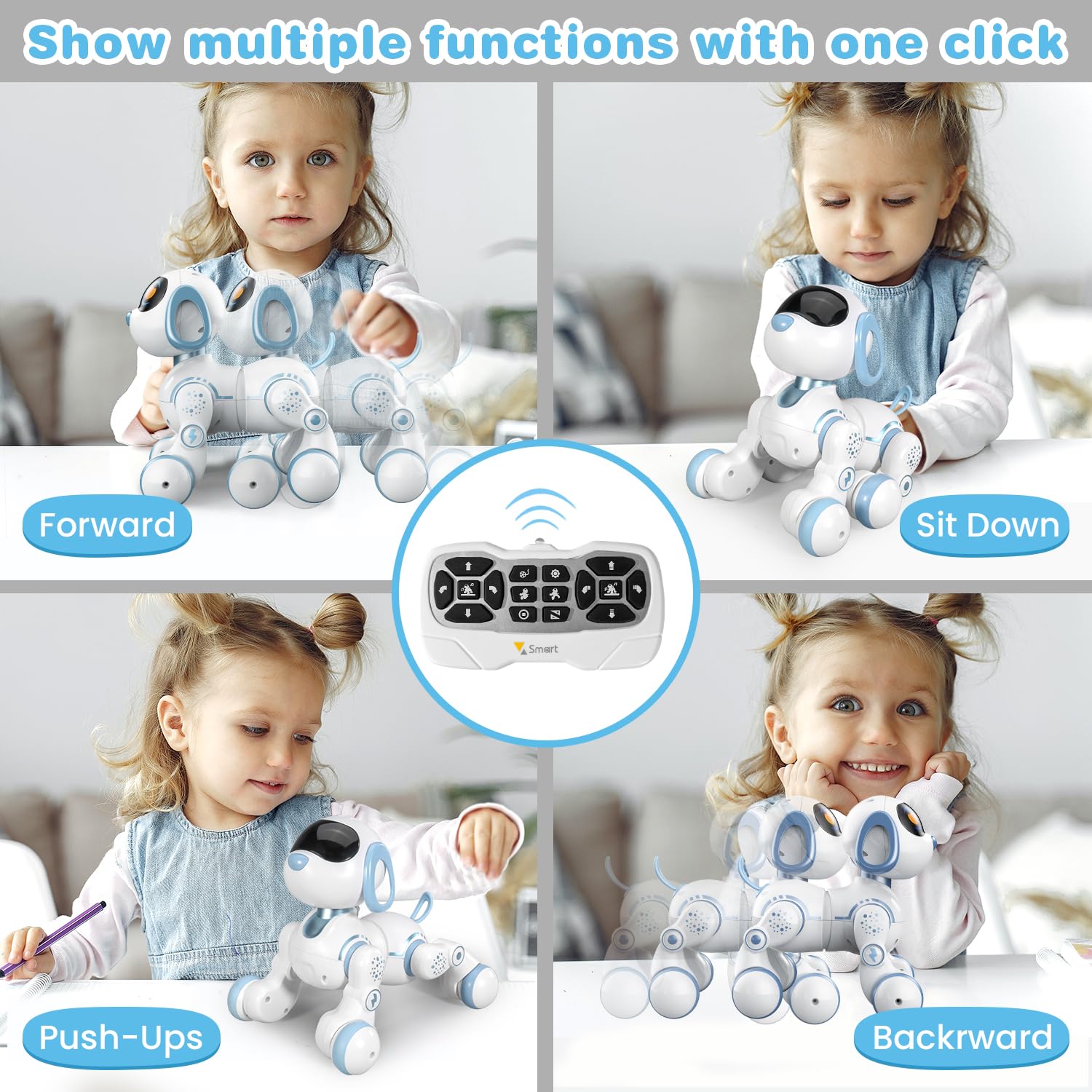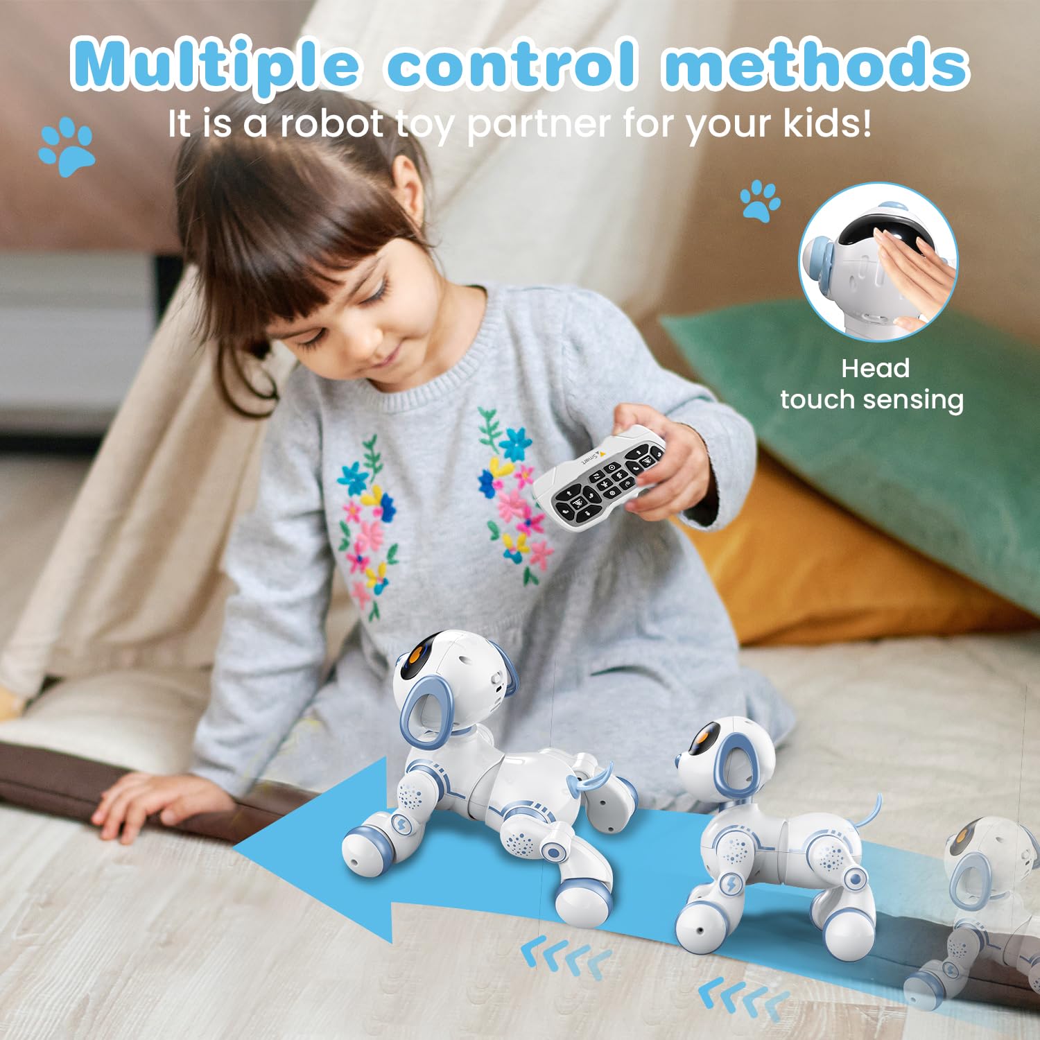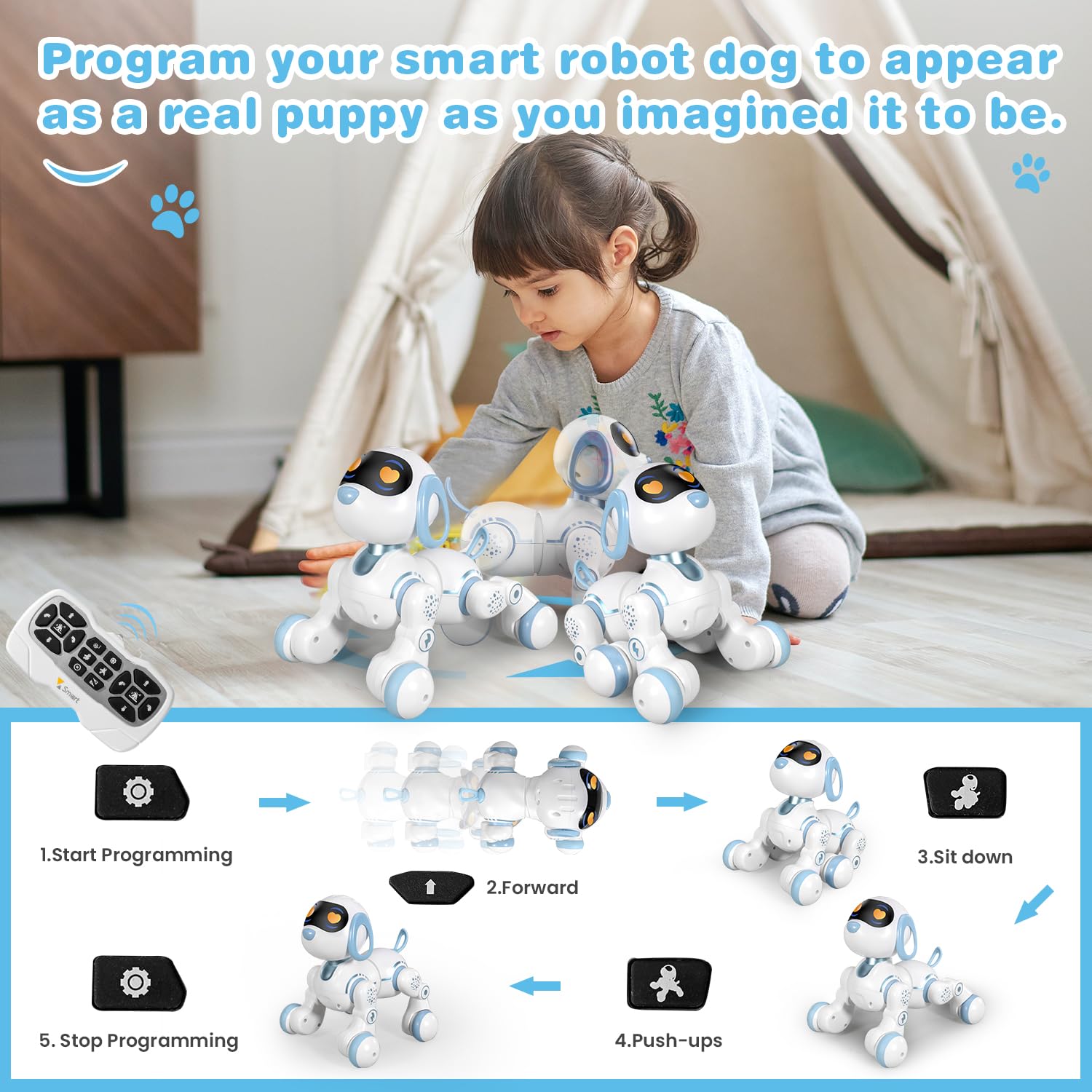 - đ¤ăProgrammable Robot ToyăThe robot dog features easy programmable functions that allow kids age 3 years and above to customize this robot dog's actions and behaviors. You can imports a series of actions that the robot toy performs by the remote controller, then the intelligent robot dog will record and execute the commands. It's both a fun and educational robot toy for kids that promotes creativity, and problem-solving skills.