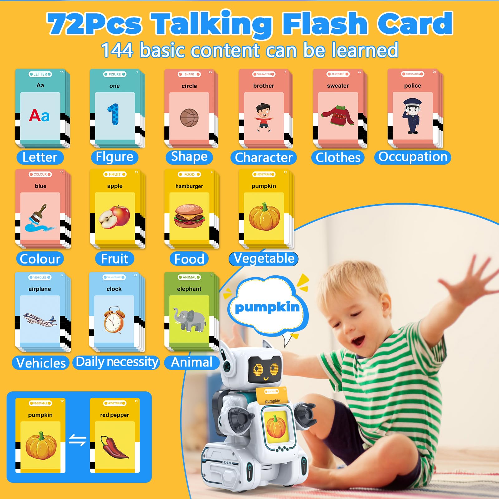 - 72pcs Talking Flash Cards: The robot includes 72 cards with 144 learning topics animal,character,letter,colour,shape,occupation,food,daily necessity,figure,fruit, vegetable,clothes. Insert a card into the robot, and it will read the content and play realistic animal or vehicle sounds. Press the repeat button to hear it again. Repetitive learning enhances memory.