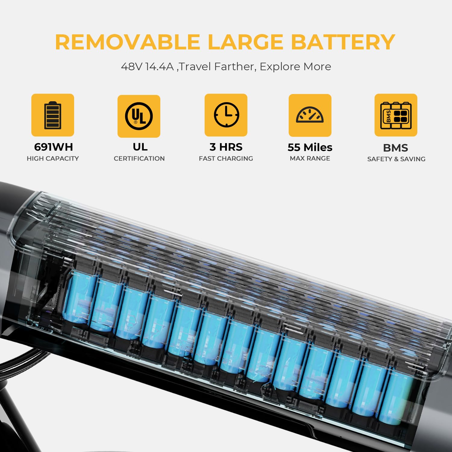 - Powerful Peak 1400 W Motor: Heybike Folding electric bike for adults equipped with a powerful 750 W (Peak 1400 W) brushless geared motor that easily climbs 30-degree slopes and achieves a maximum speed of 28 MPH, 720 WH Removable Large Battery which covers a maximum range of up to 55 miles on a single charge. Upgraded 4A fast charging technology allows you to complete a charge in only 3-4 hours, reducing waiting and enjoying more riding fun