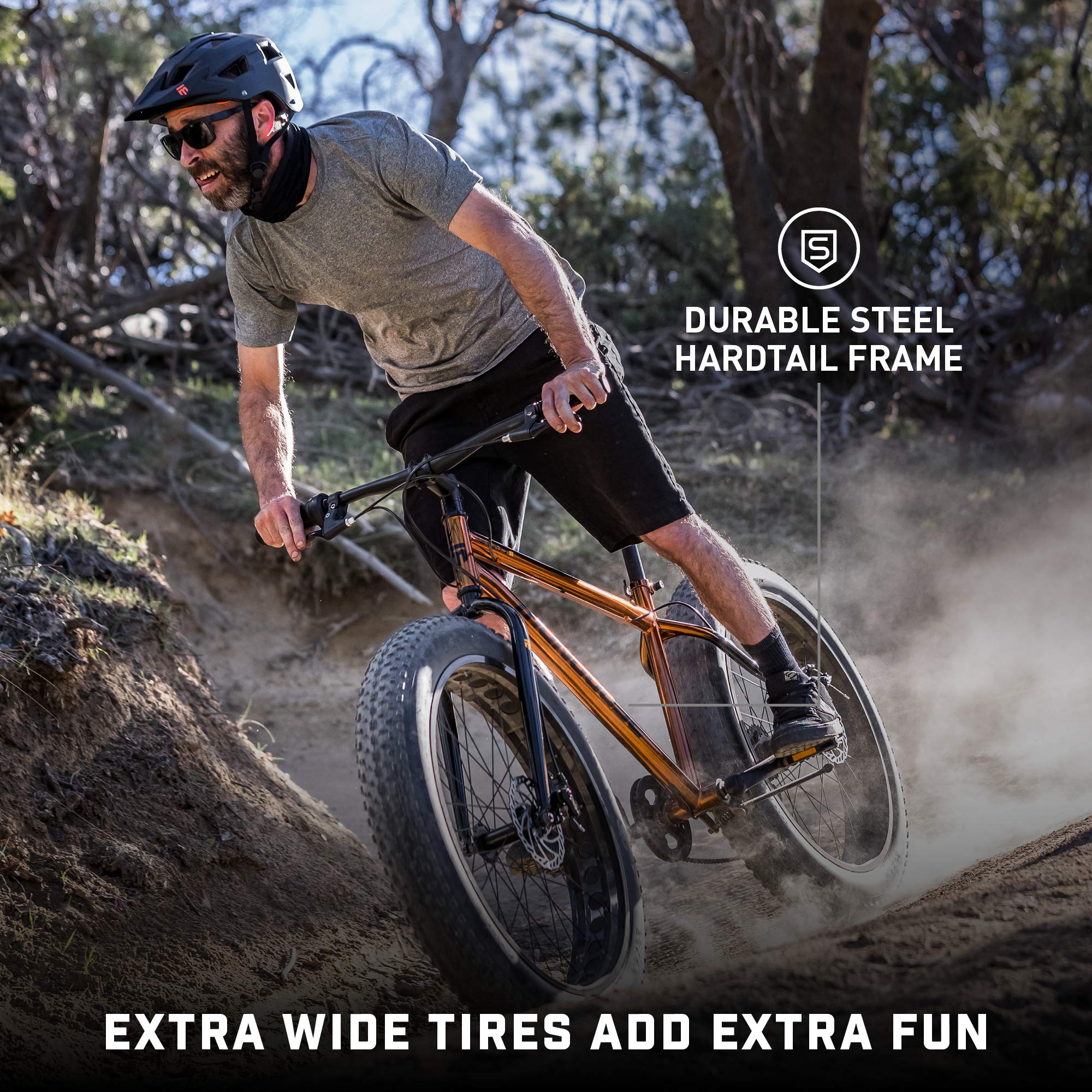 - Fat tire mountain bicycle perfect for all-terrain adventures, 26-inch wheels that fit to riders 5'5" to 6'0" tall