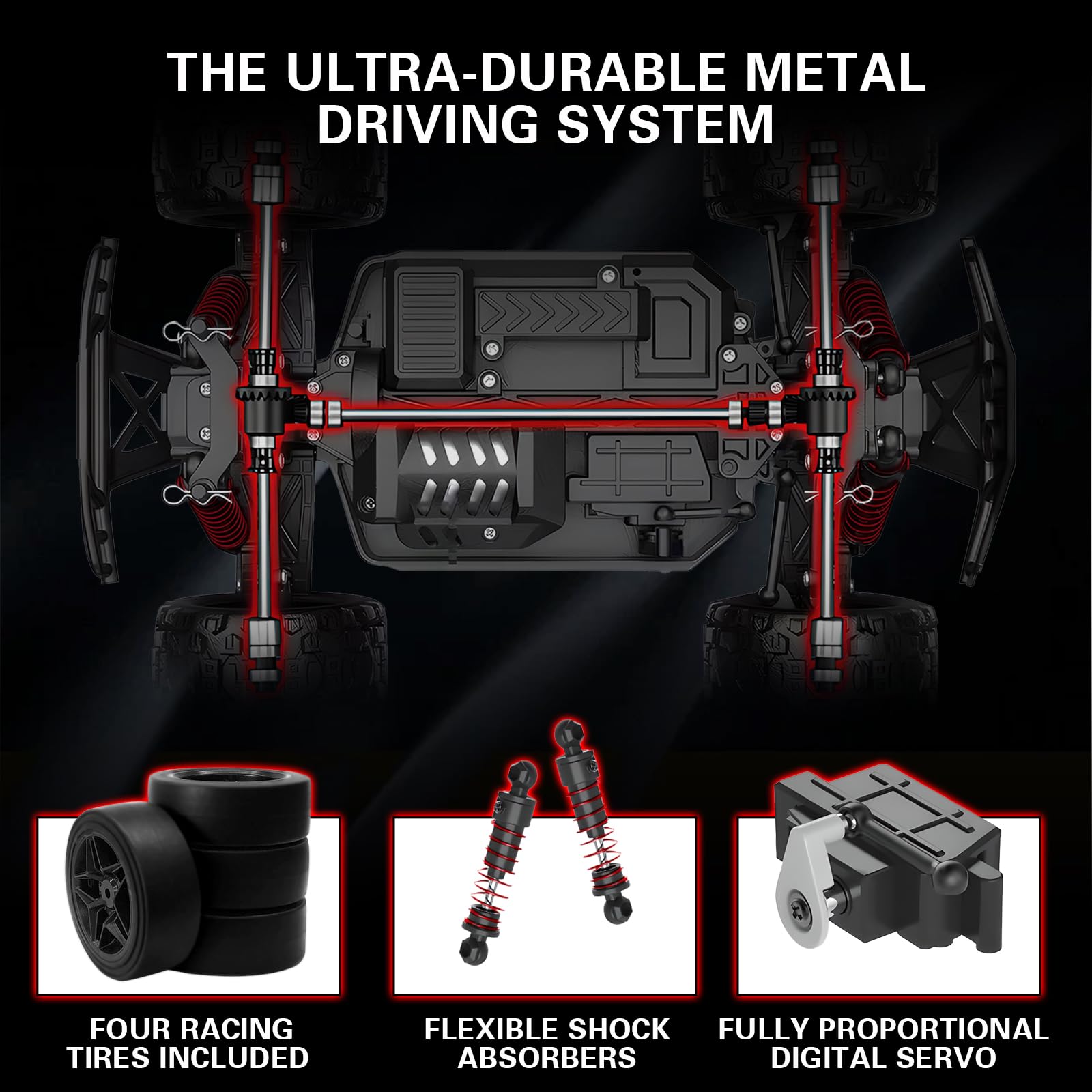 • 【Various Terrains】This vehicle features a rugged chassis plus ultra-durable metal drive shafts, a metal center body support and strong composite brace for maximum durability,with Independent suspension design w/adjustable shocks. Designed to resist impacts and minimize damage, its reinforced chassis ensures it can handle the toughest terrains, this off-road remote control car can easily overcome all terrains, whether it is slippery tiles or rugged concrete,even grass, mud and sand.