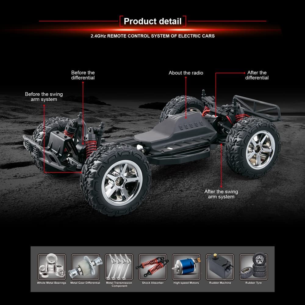 - ★ Moter with Professional Metal Heat Sink: The monster truck is equipped with a 390 motor which made a huge enhancement for the acceleration and allows the RC car to have a top speed of 35+ km/h. There is a metal heat sink that fully covers the motor to enhance motor heat dissipation so as to extend motor life.
