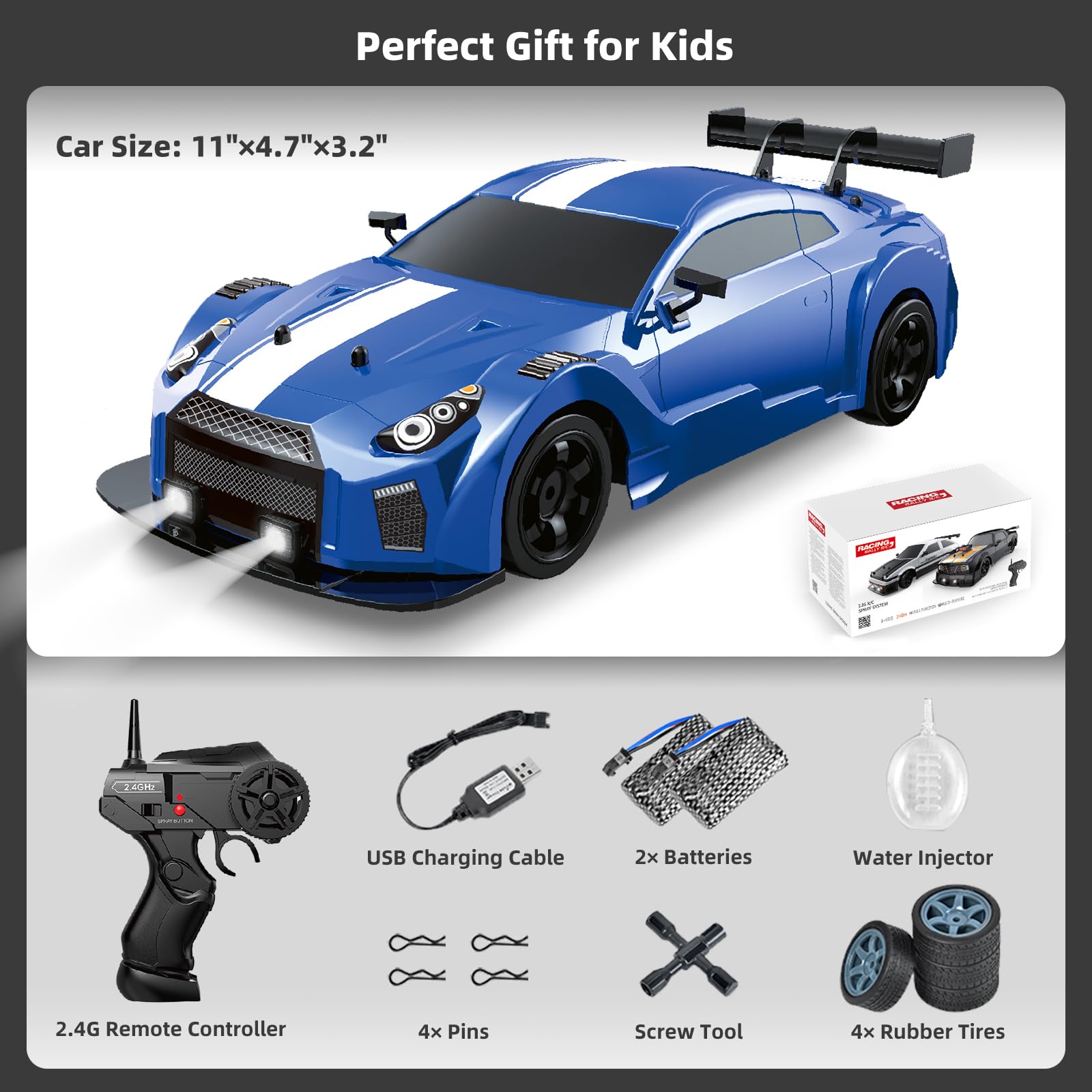 - Tire Configuration: Drift car comes with 4 speed racing tires and 4 drift tires. When you want to show off this high-speed rc drift car with stunts, you can drift on smooth boards, tiles, tracks with better handling and perfect agility, and when you want to make it a sports car, the racing tires will be your nice choice