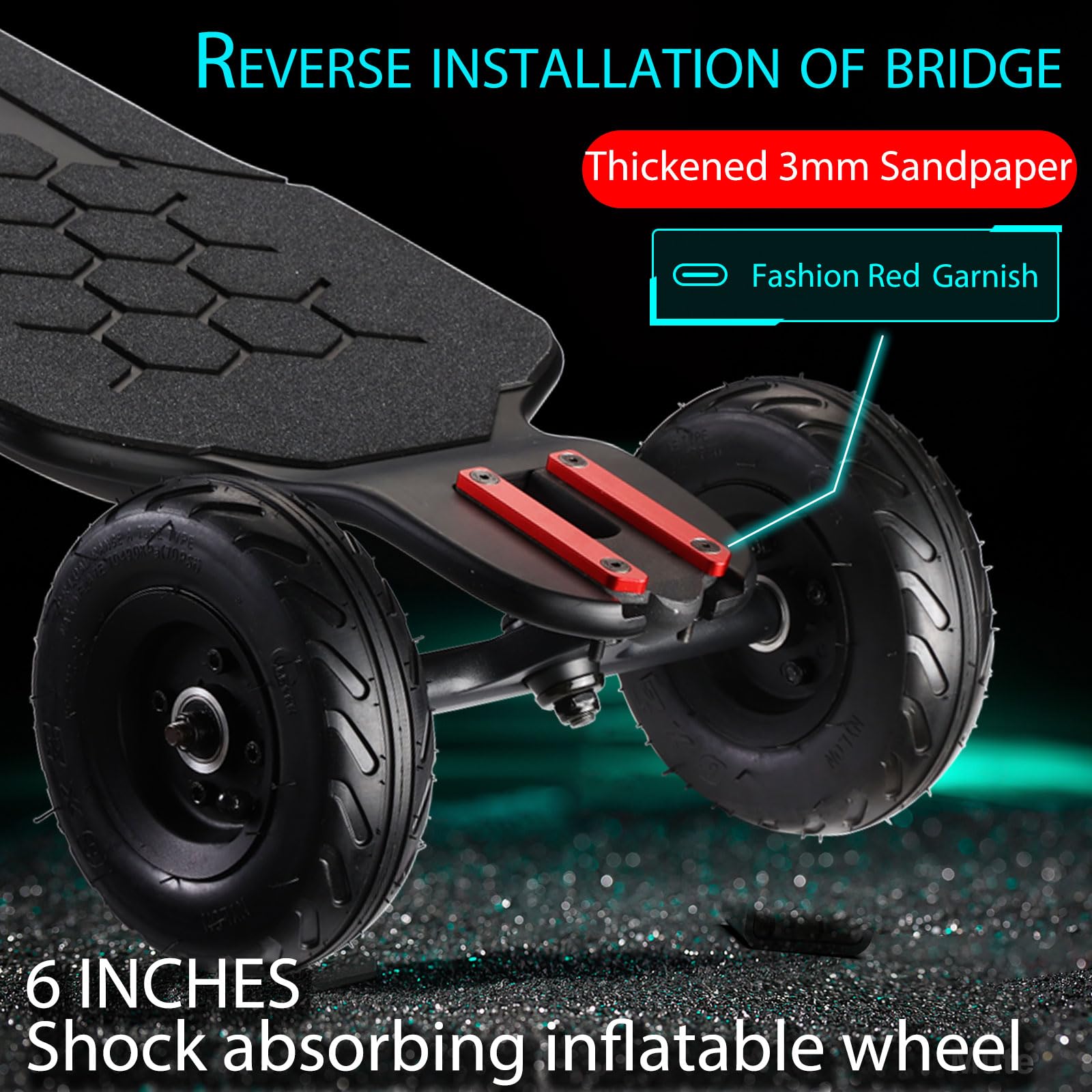 • 🛹【DROP DECK & INFLATABLE WHEELS】Wonderful shock absorption capability builded by these three parts of drop deck, reverse installation of bridge and inflatable wheels which is totally OK for all terrain. ▶ It’s equipped with a 42V 7500mah Lithium Battery with a maximum range to 18 miles, it can be fully charged within 4 hours.