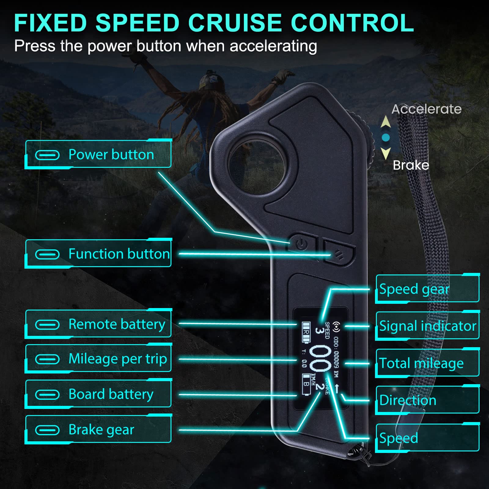 • 🛹【LCD REMOTE & FIXED SPEED CRUISE CONTROL】The WINDSEEKER Intuitive & Ergonomic Controller has an LED screen with a Battery Indicator for the controller and skateboard, speed, odometer, 4-speed selector, and forward/reverse indicator. It is easy to provides precise control and braking. ▶ The power button can get access to the FIXED SPEED CRUISE CONTROL when accelerating. Means that free your hands to operate the remote to move on and feel more freedom with the riding.
