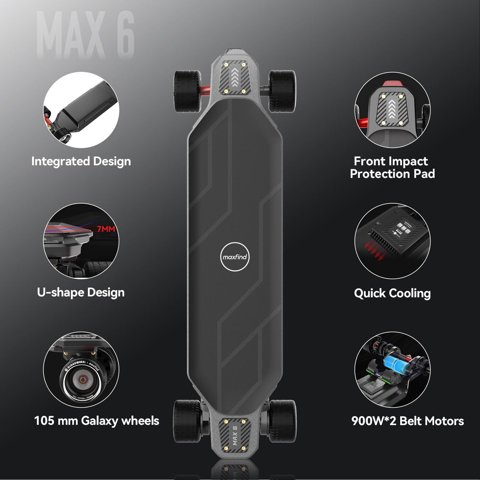 - [Package Contents] The MAXFIND MAX6 electric longboard makes a great gift. The package includes a charger, adapter cable, remote control, skateboard repair tools, and user manual. Please read the manual before use, and feel free to contact MAXFIND with any questions.