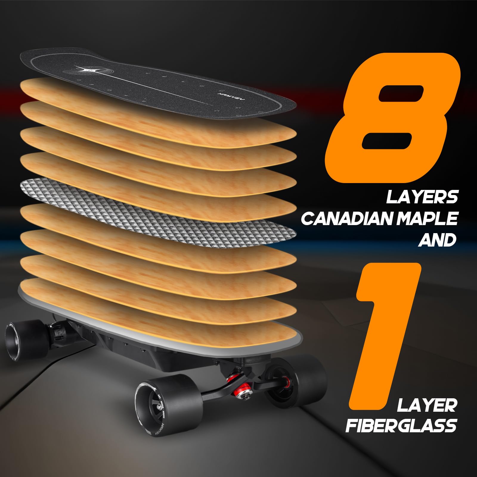 - [Durable & Safe]--The deck of the Mini 2 electric skateboard is made of 8 layers of canadian maple and 1 layer of fiberglass, the combination of these two materials makes the deck strong, corrosion-resistant and maintains good toughness, thus extending the service life of the deck.