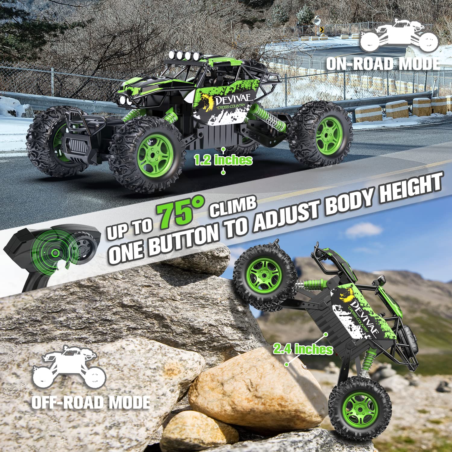 - 2 Driving Modes for All terrains: The large rc car for boys is equipped with a lifting device for 2 driving modes, Off-Road Mode with 75° for passing rock, stone and mud terrain, and On-Road Mode for grass, sand roads, different fun & driving experiences