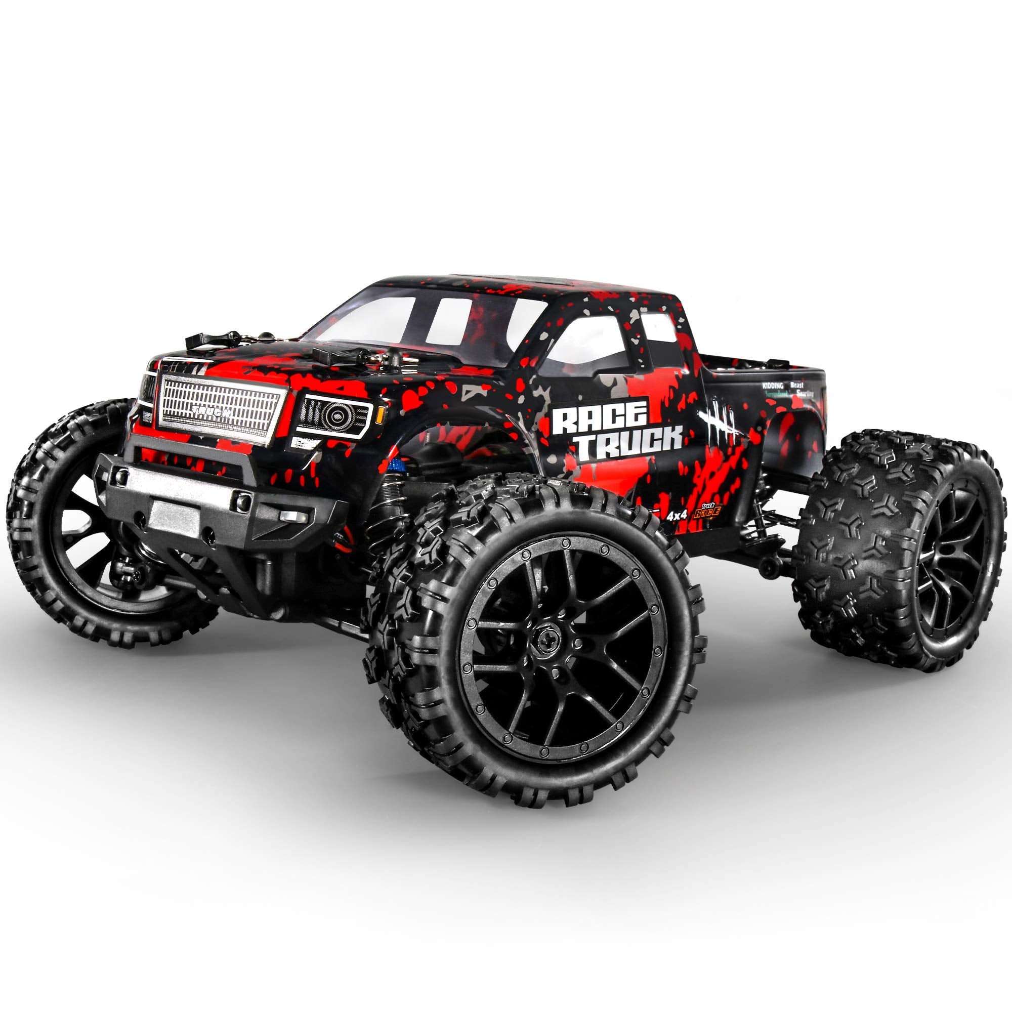 • 2.4GHz full-function proportional radio control system suffices a stable control range within 280 feet. Reliable transmission forward, brake and reverse would never fail. Splash waterproof electronic components make a all-terrain vehicle out of this truck. No worries to run this truck on grassland , sands, and bumpy grounds