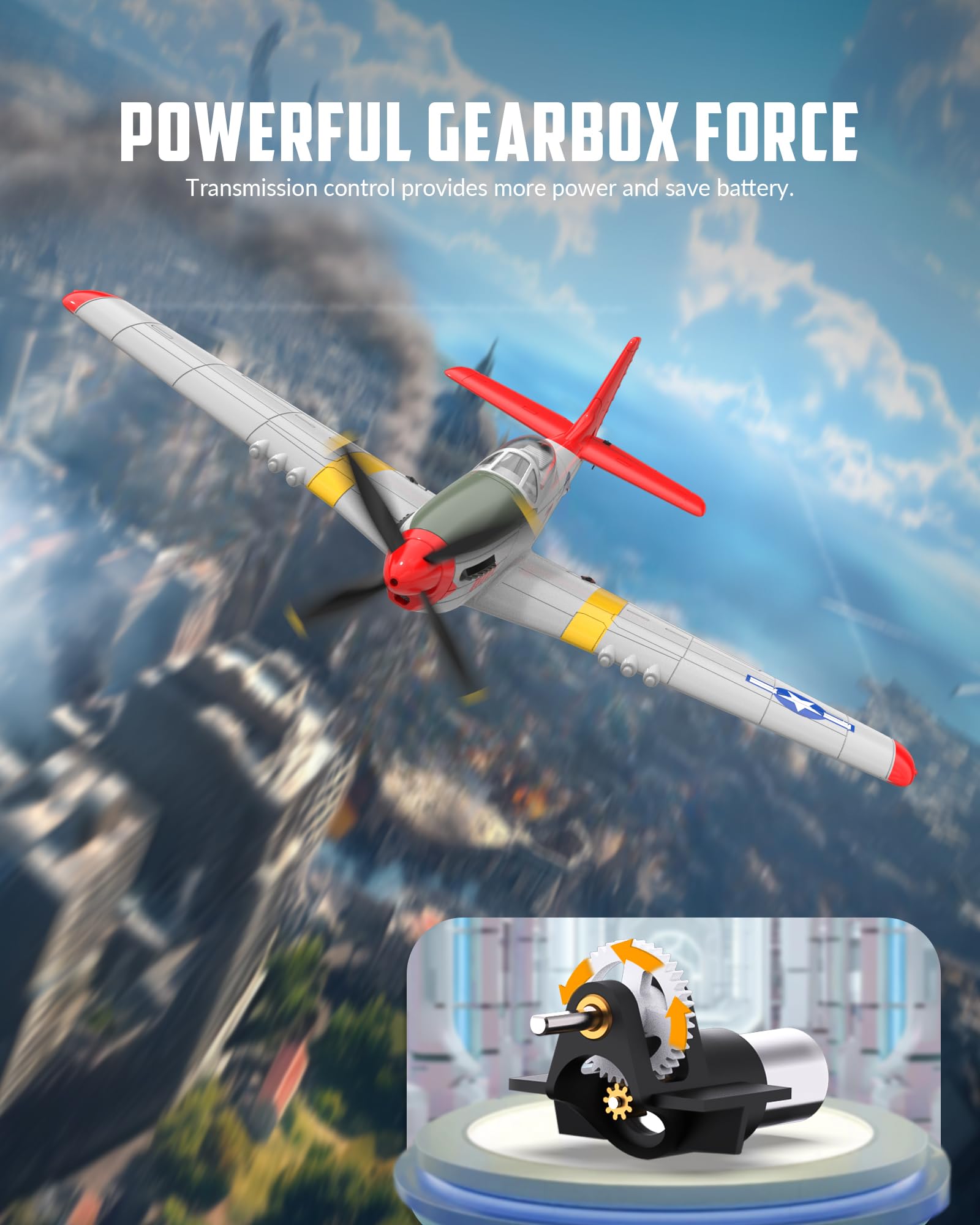 - [Thrust WWII RC Plane Ready to Fly] The RC plane's gearbox system increases its thrust and efficiency, allowing pilots to extend its flying time and speed. With this system, the plane may fly continuously for up to 20 minutes.
