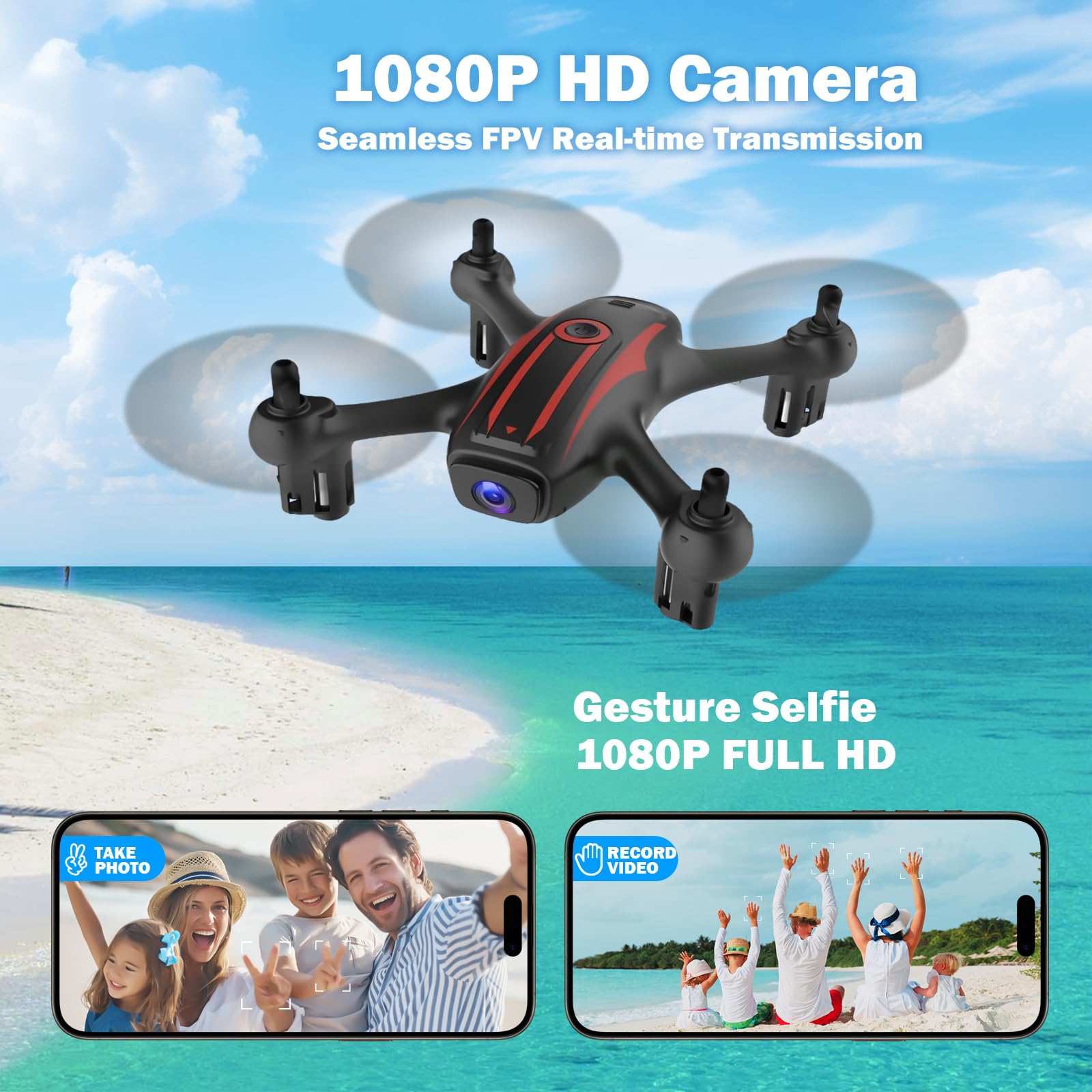 • [Drone with 1080P Camera] Capture clear, vibrant aerial shots with the drone's 1080p HD camera. Featuring FPV transmission, you can enjoy real-time video feeds directly on your smartphone, making every flight feel like you're in the cockpit. With gesture control shooting, taking photos and videos has never been easier—just wave your hand to snap the perfect shot, perfect for capturing family moments, travel adventures, or even stunning landscapes.