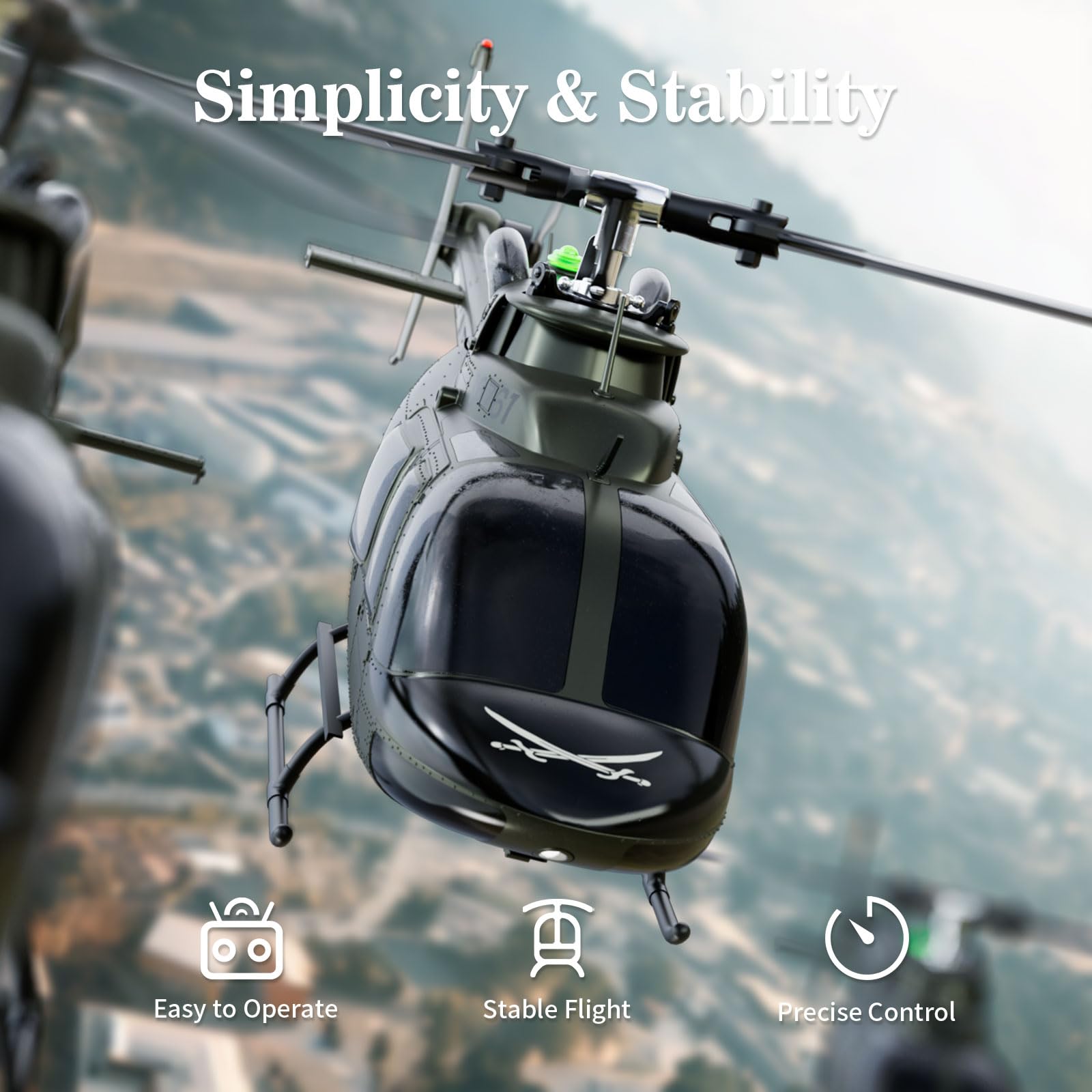 - 【Simplicity and Stability】 Equipped with both automatic and manual modes, auto-hover functionality, a standard six-channel remote, and a no-aileron design, this helicopter is powered by dual-axis co-driven motors and an electronic stabilization system, featuring a 6-axis gyroscope, 2511 1200KV brushless motor, and three 4.3g metal gear servos. Enjoy simple operation with enhanced stability, precise stick output, and reliable flight even in winds up to 4-5 levels. With its stable, swift, and accurate flight capabilities, it's ideal for beginners to master the art of flying.