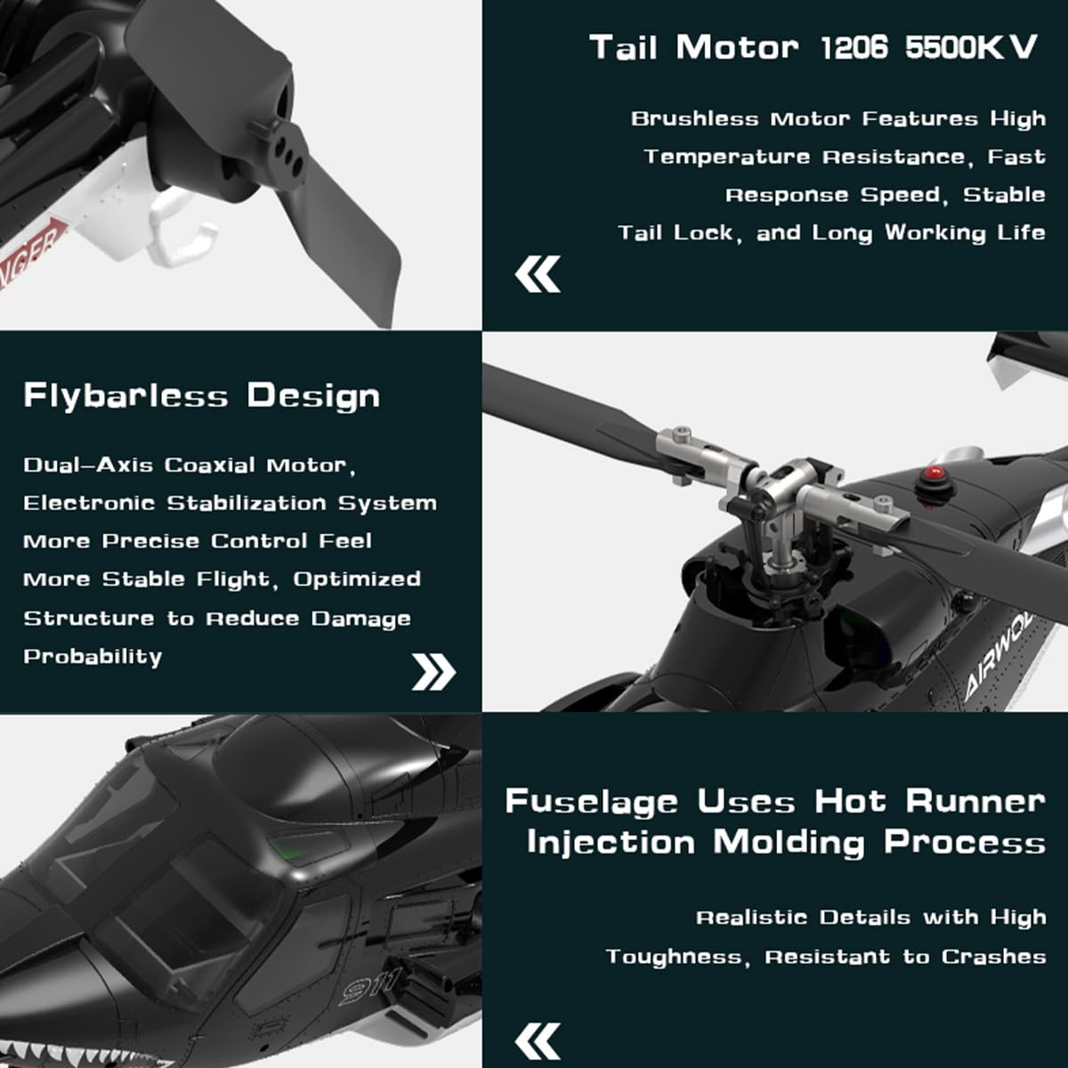 - Advanced Stability & Precision Flight System: This flybarless RC helicopter features a dual-axis direct-drive brushless motor system and an electronic stabilization system, delivering smoother, more precise control and enhanced flight stability. Made from a nylon + carbon fiber composite, the propellers offer high strength, superior flexibility, and impact resistance for long-term use.
