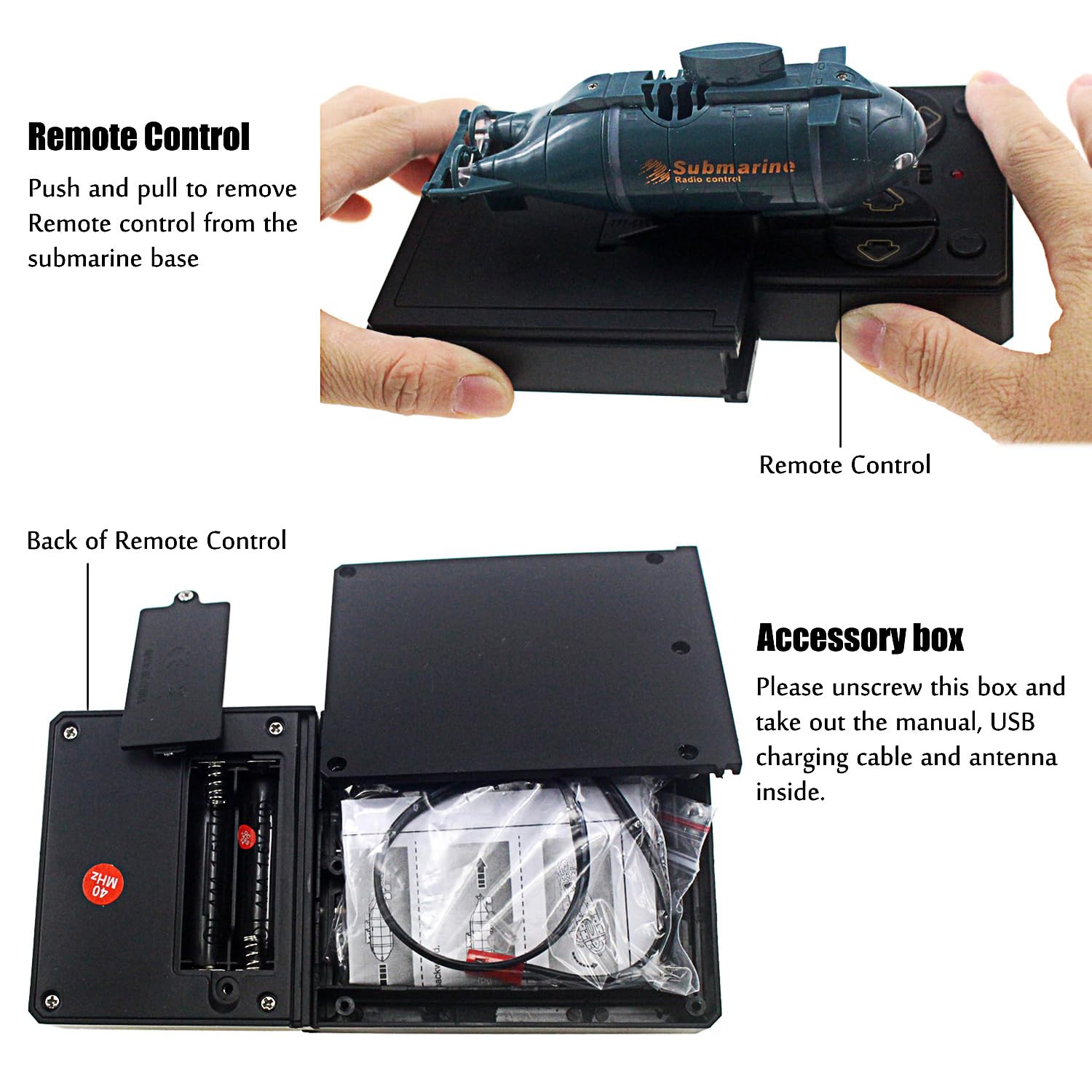 - 【Easy to Charge】The submarine integrates a built-in rechargeable battery, and it can be charged by USB charging cable. The Remote Controller requires 2 AAA batteries (Not Included)