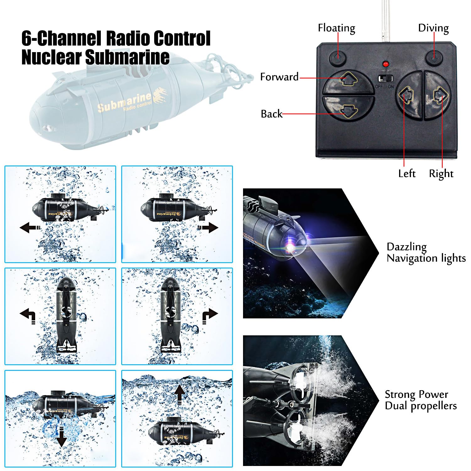 - 【Multifunction】It is a 6 channel RC toy which can go forward/backward, turn left/right, dive, float upward. There are also two navigation lights at the head of the submarine, which will light up when sailing in the water.