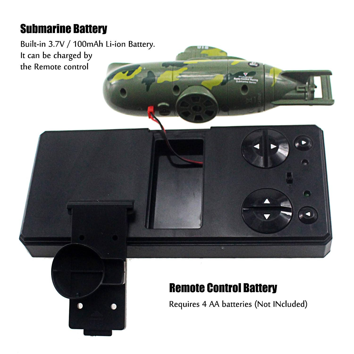 - The submarine comes with built-in battery; Remote control powered by 4 x AA battery (Not Included)