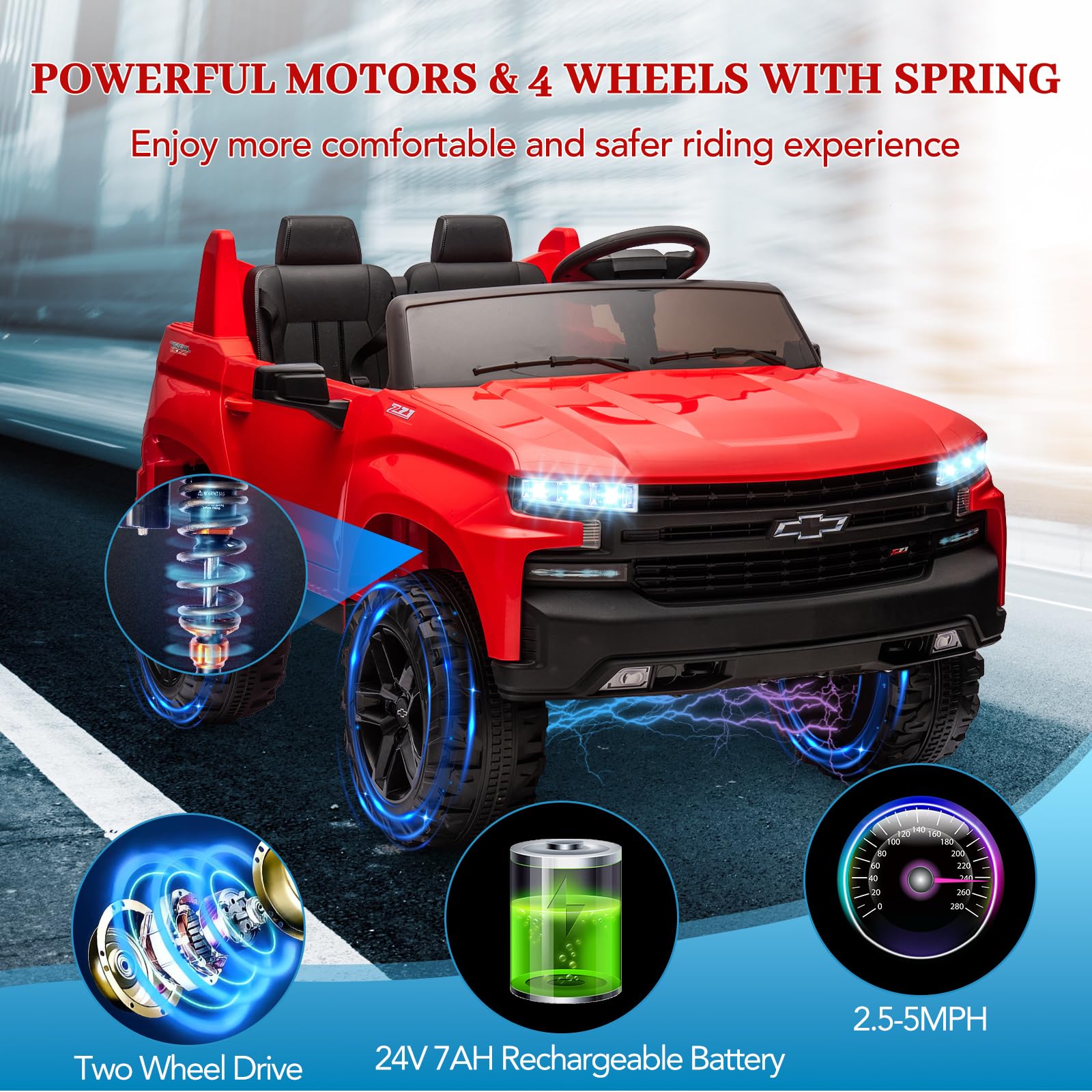 - 【Licensed Chevrolet Silverado】This 24V Officially-licensed Chevrolet Silverado 2 seater truck battery powered car is equipped with powerful 2x120W motors and a 24V 7AH rechargeable battery, providing more power, longer driving range and a top speed of 5 miles/hour on any terrain. Your child will have an exciting and enjoyable driving experience.