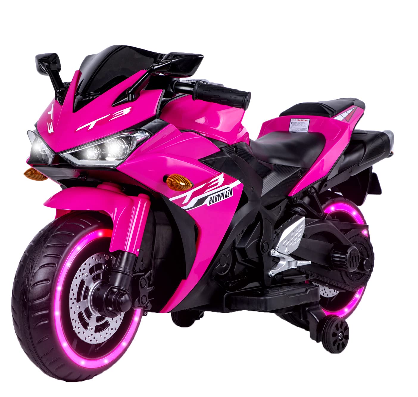 Kids Electric Motorcycle with Training Wheels, Light Wheels, Ride On Motorbike, Speed by Hand, Music Function, Max Load 66LB (Pink)