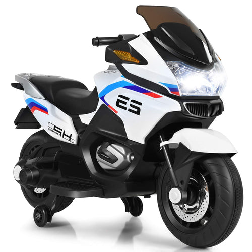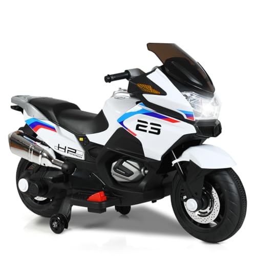 Kids Ride On Motorcycle, 12V Electric Battery Powered Ride On Bike w/Training Wheels, LED Lights (White)