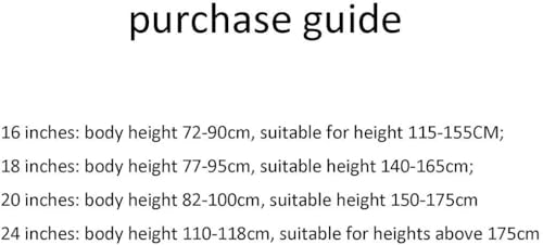 - 16 inch: body height 72-90cm, suitable for height 115-155CM; 18 inch: body height 77-95cm, suitable for height 140-165cm; 20 inch: body height 82-100cm, suitable for height 150-175cm