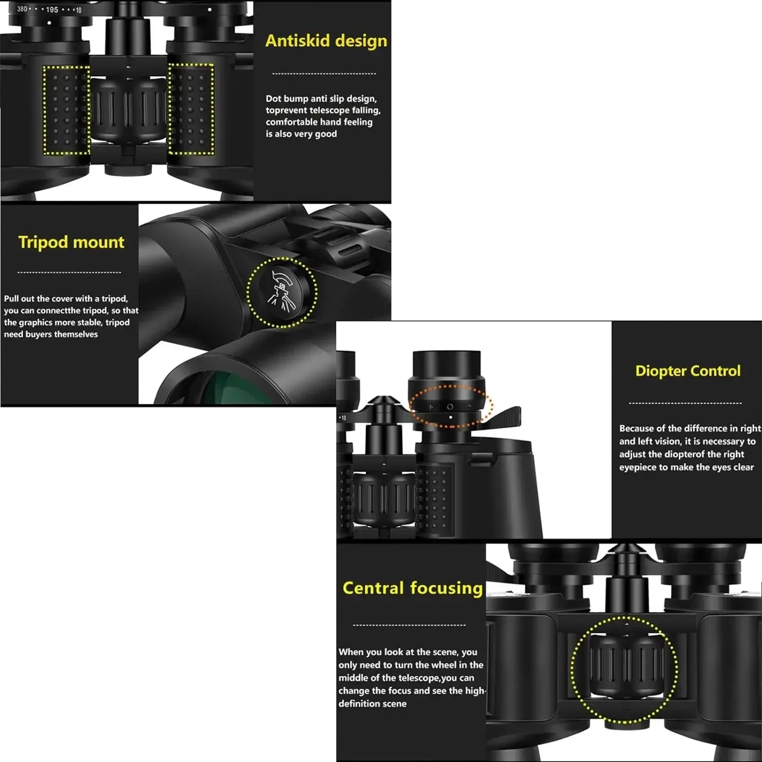 Experience unparalleled clarity and precision with the 10-380X100 Zoom Binoculars, designed for avid bird watchers, hunters, and outdoor enthusiasts. Featuring high-definition optics and a BAK4 prism system, these binoculars deliver exceptional light transmission and image brightness, ensuring vivid detail even in low-light conditions. The versatile zoom range allows for quick adjustments, making it easy to focus on distant subjects, while the durable construction ensures reliability during your adventures. Ideal for hiking and traveling, these binoculars are a must-have for anyone seeking to enhance their outdoor experience.