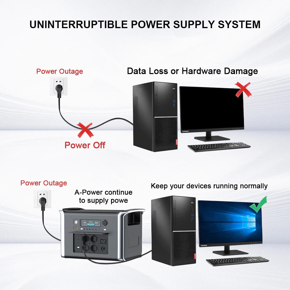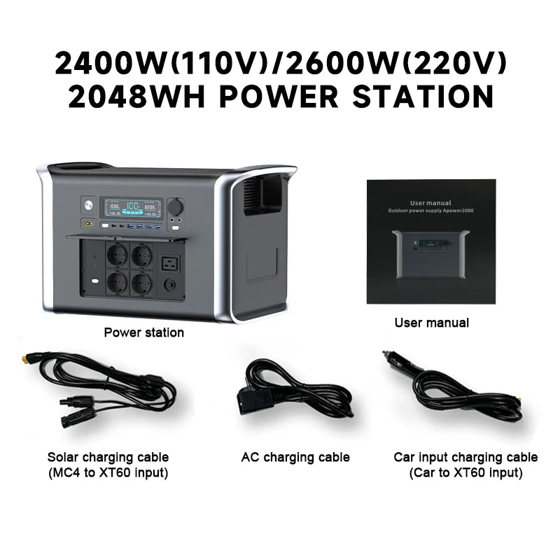 The 2600W 2400W Portable Power Station is a versatile and reliable energy solution, ideal for camping, outdoor activities, and emergency backup. Featuring advanced LiFePO4 battery technology, this UPS power supply ensures long-lasting performance and safety. With its robust design, it serves as a solar electric generator and power bank, allowing for convenient recharging of multiple devices. Compact and portable, this power station is an essential companion for those seeking dependable power on the go.