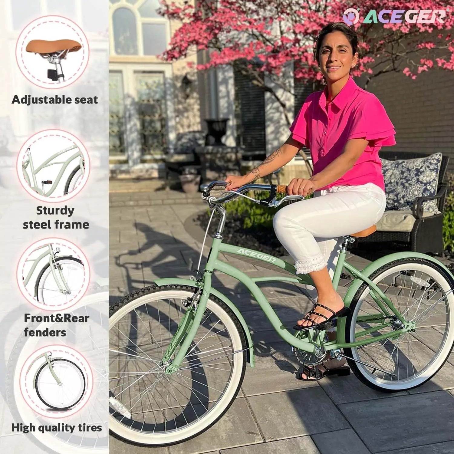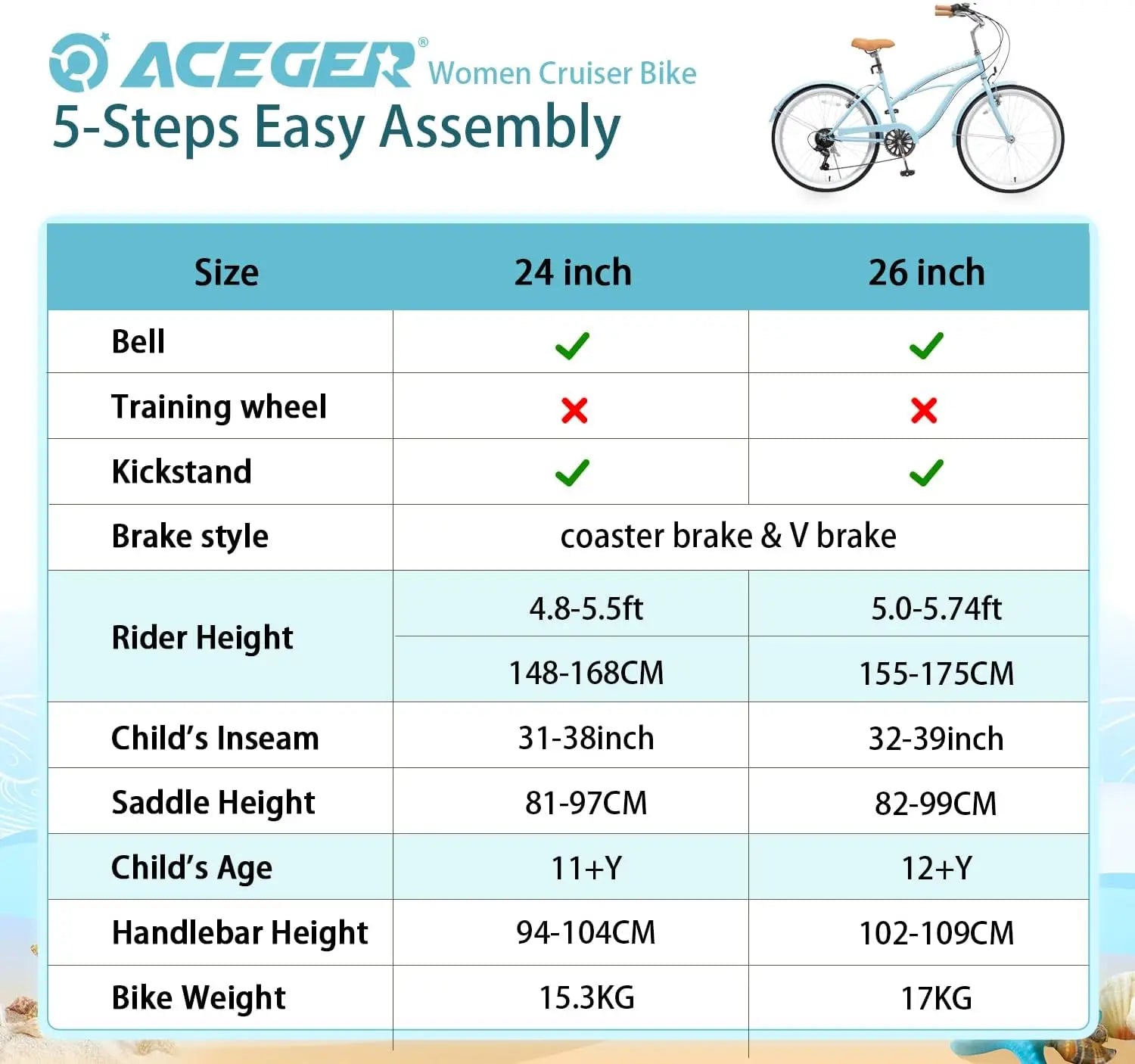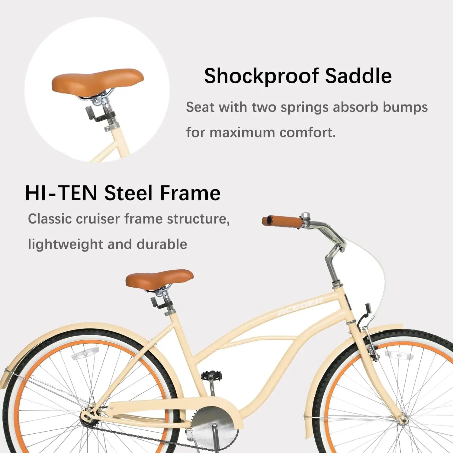 Cruise in style with the ACEGER 24 26 Inch Women Beach Cruiser Bike. This Adult Hybrid Bike is the perfect commuter bicycle, offering both Single Speed and 7 Speed options to suit your needs. The Hi-Ten Steel Frame ensures a comfortable and smooth ride every time. Don't miss out on this top-of-the-line bike!