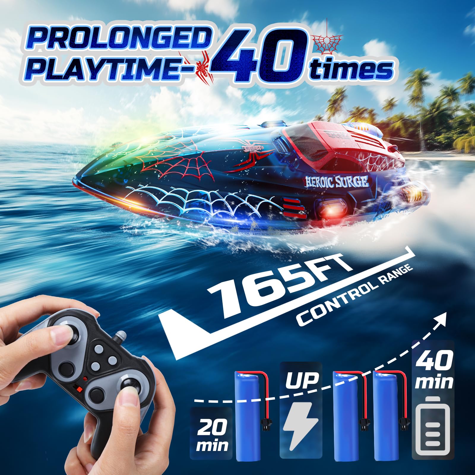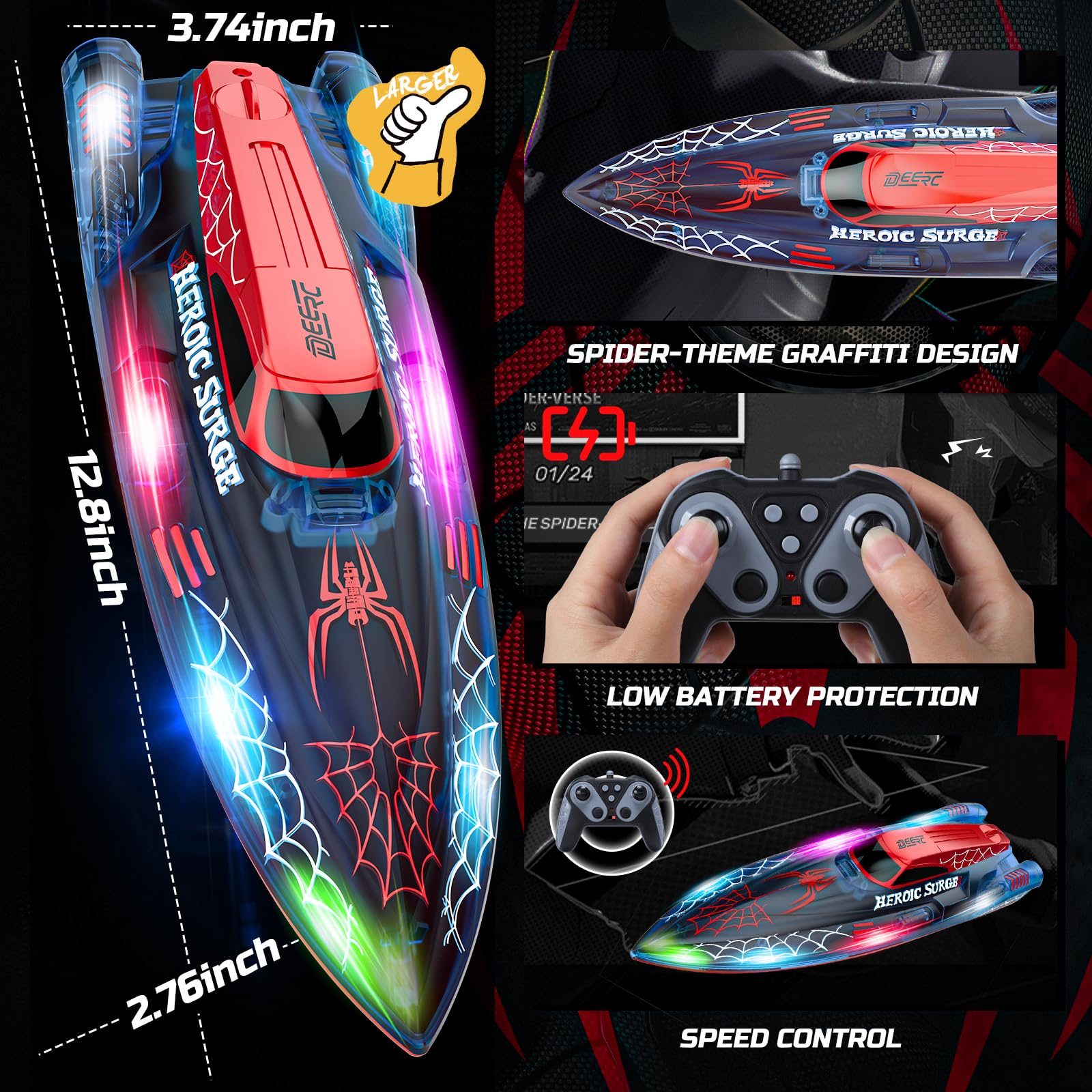 - Glowing Spider RC Boat – Bigger, bolder, and brighter! Measuring 12.8 inches long—larger than the standard 9.8-inch RC boats—this spider-themed cruiser is built to stand out. Featuring dynamic graffiti and vibrant, colorful bulbs across the entire hull, it’s sure to be a favorite among kids. Why settle for ordinary remote control boat when you can dominate the water in style? Perfect for night adventures, it's the ultimate cruiser for endless fun on the water!